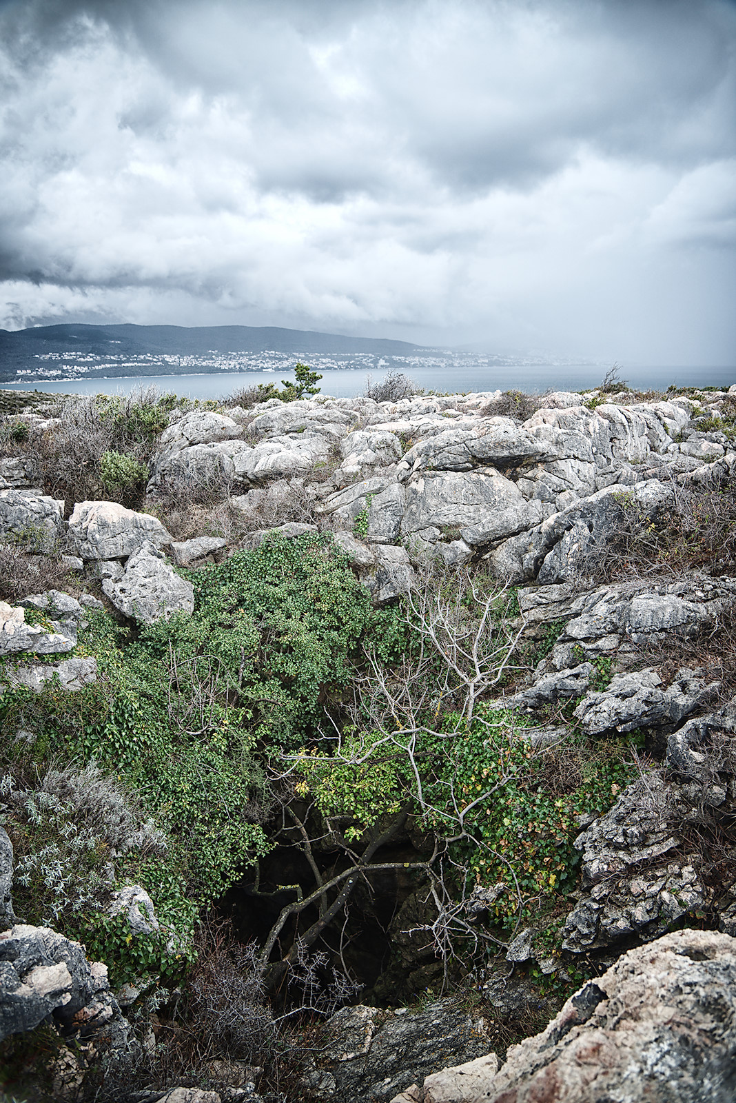 Weil der Regenschleier doch nicht in unsere Richtung zu ziehen scheint, beschließen wir noch zu einer kleinen Meeresbucht gleich unterhalb der Höhle zu wandern. Keine hundert Meter von der Tropfsteinhöhle entfernt blicken wir in den Abgrund einer Doline, deren Boden in einem schwarzen Loch verschwindet. Dies dürfte wohl der Eingang zu einer weiteren Höhle sein, die allerdings nicht erschlossen ist.