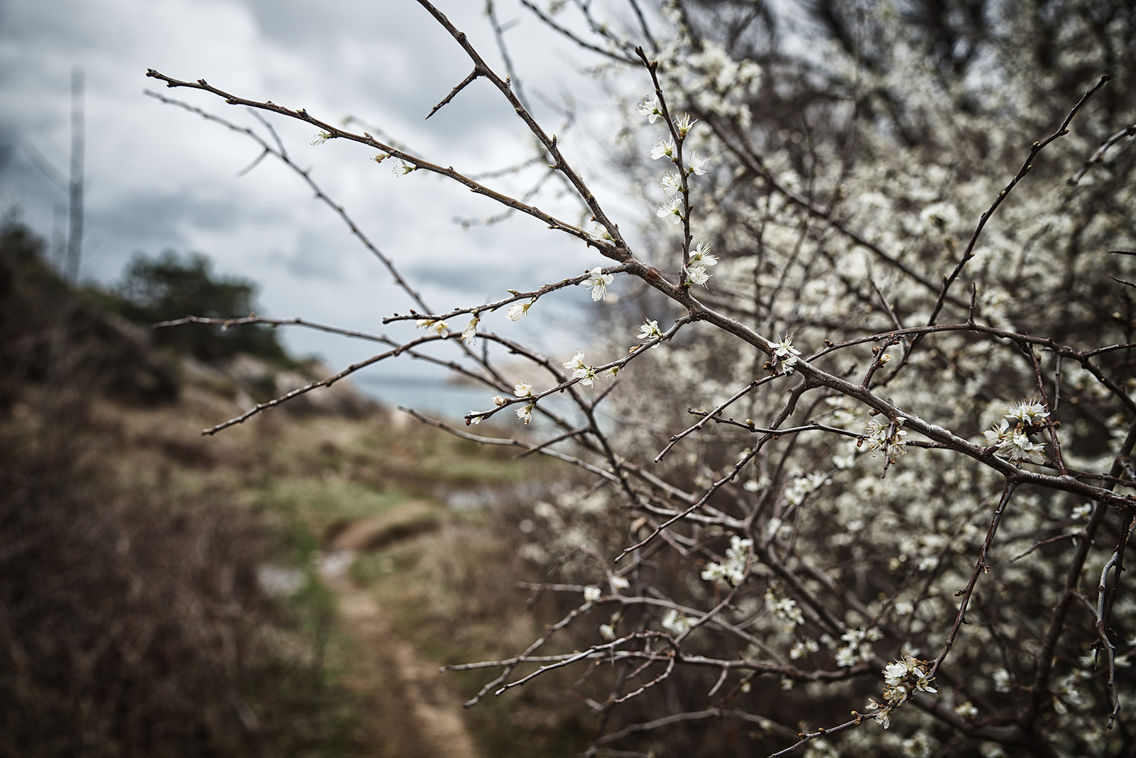 Von der Bucht aus haben wir keinen guten Blick auf den Horizont und so treten wir rasch wieder den Rückweg an, um nicht unverhofft in ein Gewitter zu geraten. Zurück geht es auf einem Karrenweg, der vom Höhleneingang in die kleine Bucht führt. Die Strecke ist zwar geringfügig länger, dafür müssen wir nicht über die Felsstufen aufsteigen und kommen insgesamt schneller voran. Kurz bevor wir wieder das Eingangshäuschen der Tropfsteinhöhle erreichen, vernehmen wir ein erstes Donnergrollen. Der Himmel verfinstert sich immer mehr. Als wir beim Auto sind, beginnt es zu regnen. Was für ein Timing!
