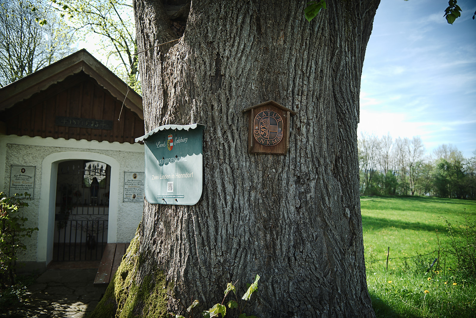 Dann geht es erst einmal ein kurzes Stück auf der gar nicht so wenig befahrenen Verbindungsstraße nach Henndorf, ehe der Weg an einer großen Linde links in eine Nebenstraße abzweigt. Hier herrscht eigentlich Fahrverbot, ausgenommen die Bewohner der wenigen Häuser dieser Straße. Auf ein paar Autos, deren Fahrer den Begriff „Anrainer“ recht sportlich auslegen, sollen wir aber dennoch stoßen. Ansonten gehört die Straße aber den Radfahrern und Wanderern. Wir bewegen uns auf einem Teilstück des österreichischen Jakobsweges und des Wallerseerundweges.