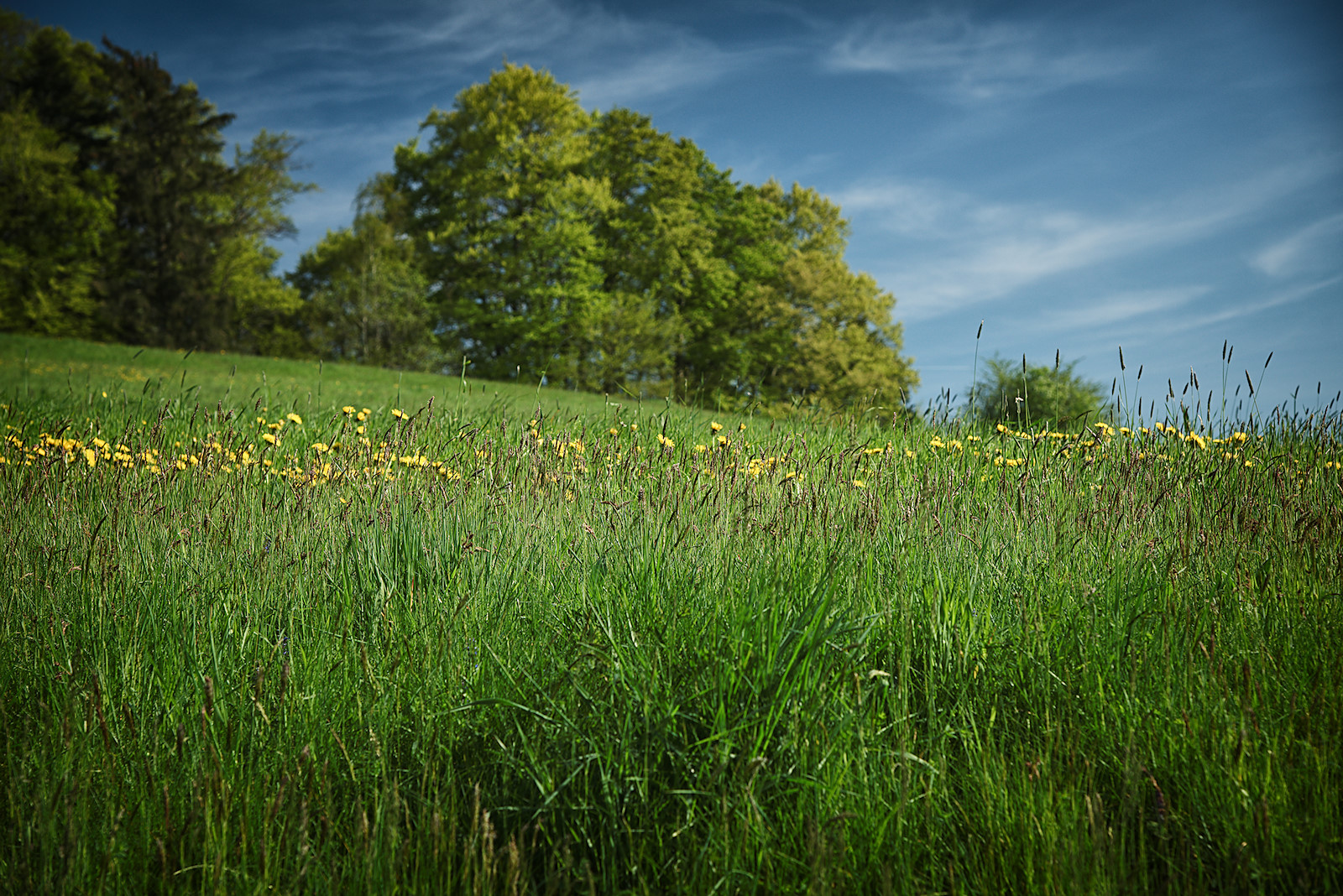 Der Weg verläuft nun mäßig steil bergauf, vorbei an blühenden Wiesen und dem jungen Grün des Waldes.