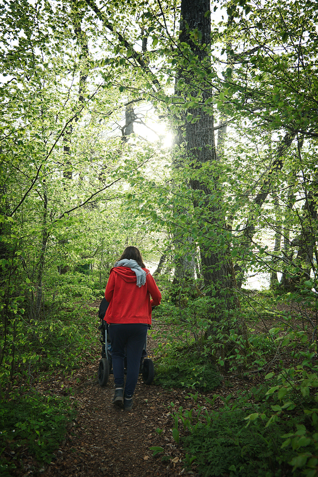 Dann ist es geschafft: Die Strandhäuser enden und die naturbelassene Marieninsel beginnt. Der Weg ist nun ein ausgetretener Trampelpfad mit einigen Wurzeln, über die es den Kinderwagen so sanft wie möglich zu steuern gilt. Ein geländegängiger Kinderwagen ist hier auf jeden Fall von Vorteil. Unserer kommt so ziemlich an seine Grenzen, was die Stoßdämpfung betrifft.