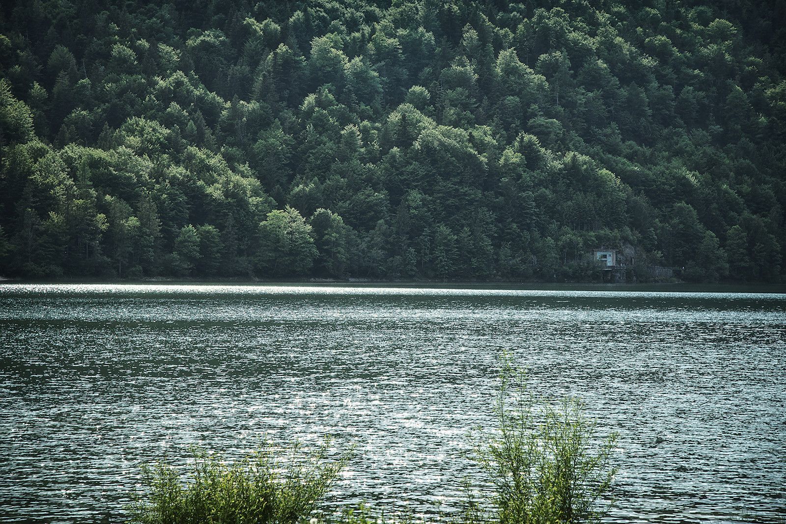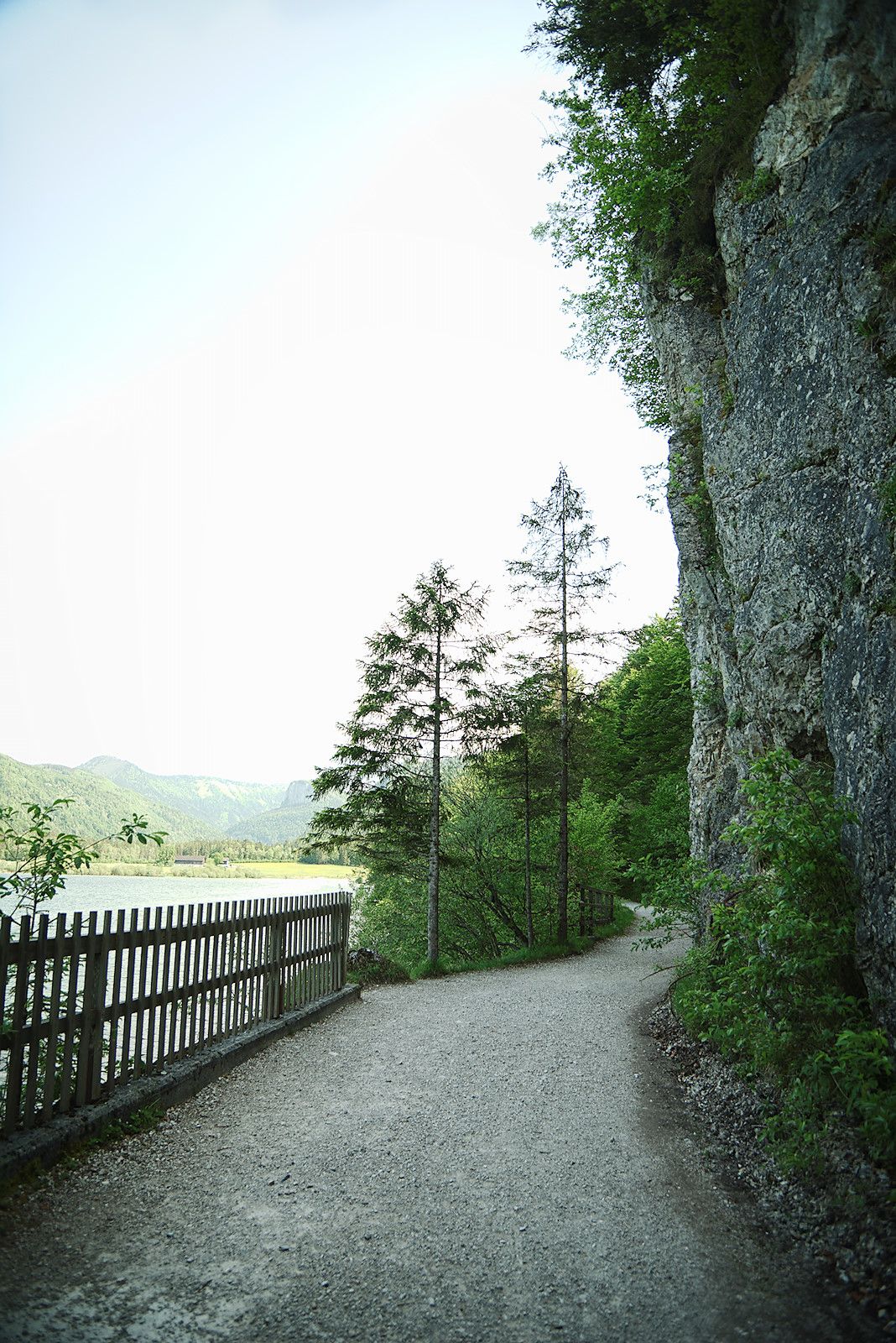 Auf der anderen Seite erwartet uns der wild-romantische Westuferweg. An der Pumpstation und einigen Felswänden vorbei führt er meist angenehm schattig zum südlichen Ende des Sees. Auf dieser Trasse verlief übrigens bis in die 1950er Jahre eine Schmalspureisenbahn zwischen Vorder- und Hintersee. Mit ihr wurde das geschlagene Holz von den Wäldern in Hintersee zum Sägewerk in Vordersee transportiert. Gerade im ersten Teilstück nach der Brücke zeichnen sich die hölzernen Schwellen noch deutlich am Weg ab. Mit dem Kinderwagen gilt es also etwas am Wegrand zu bleiben, ansonsten werden die Kleinen ganz schön durchgebeutelt.