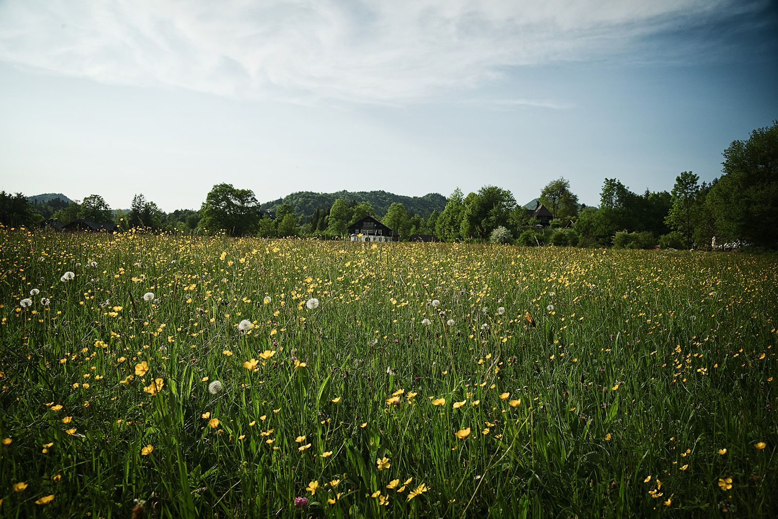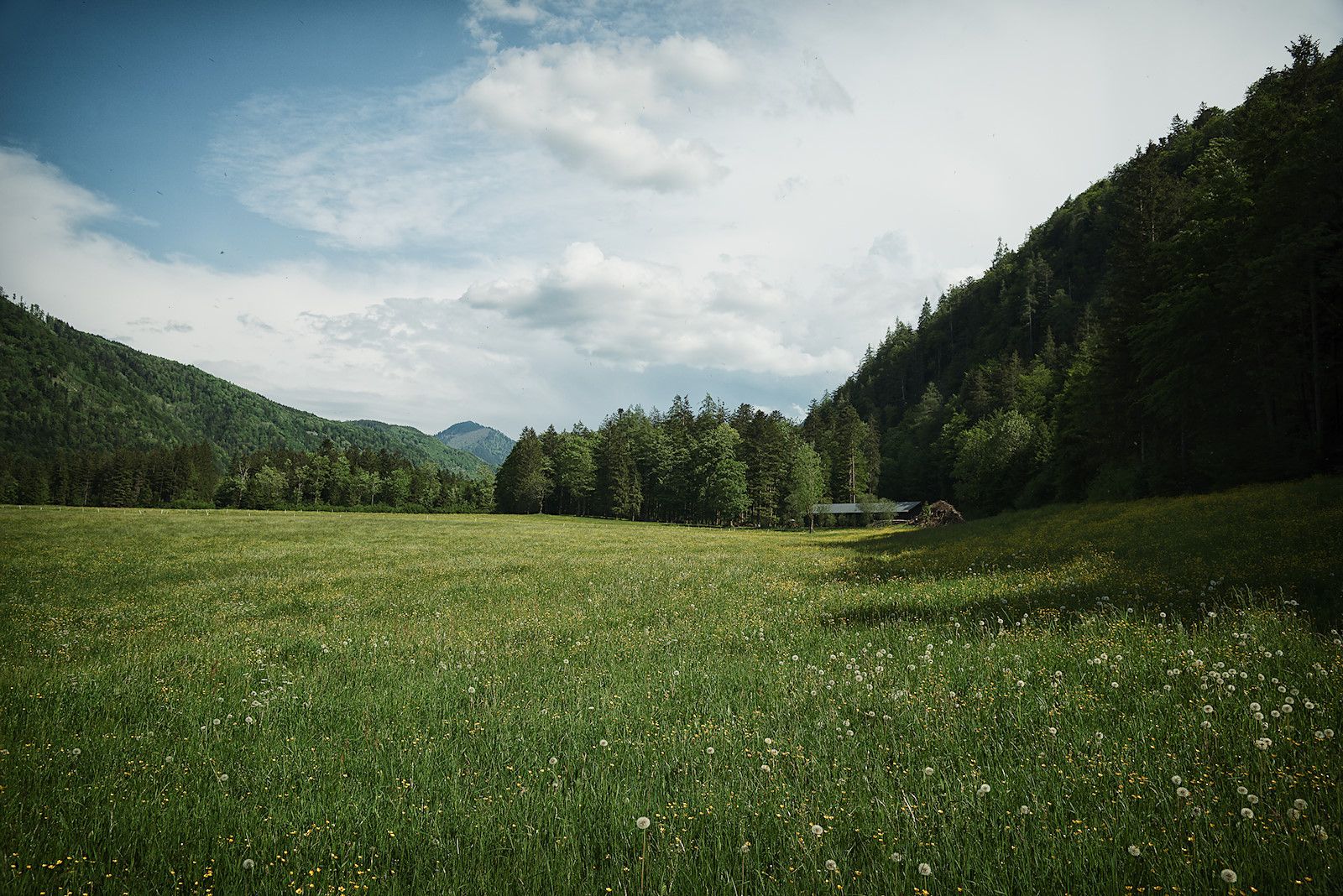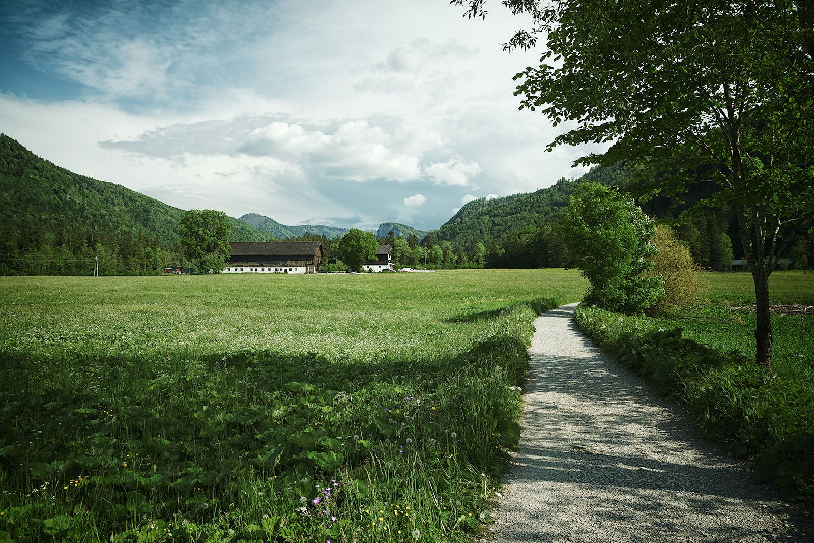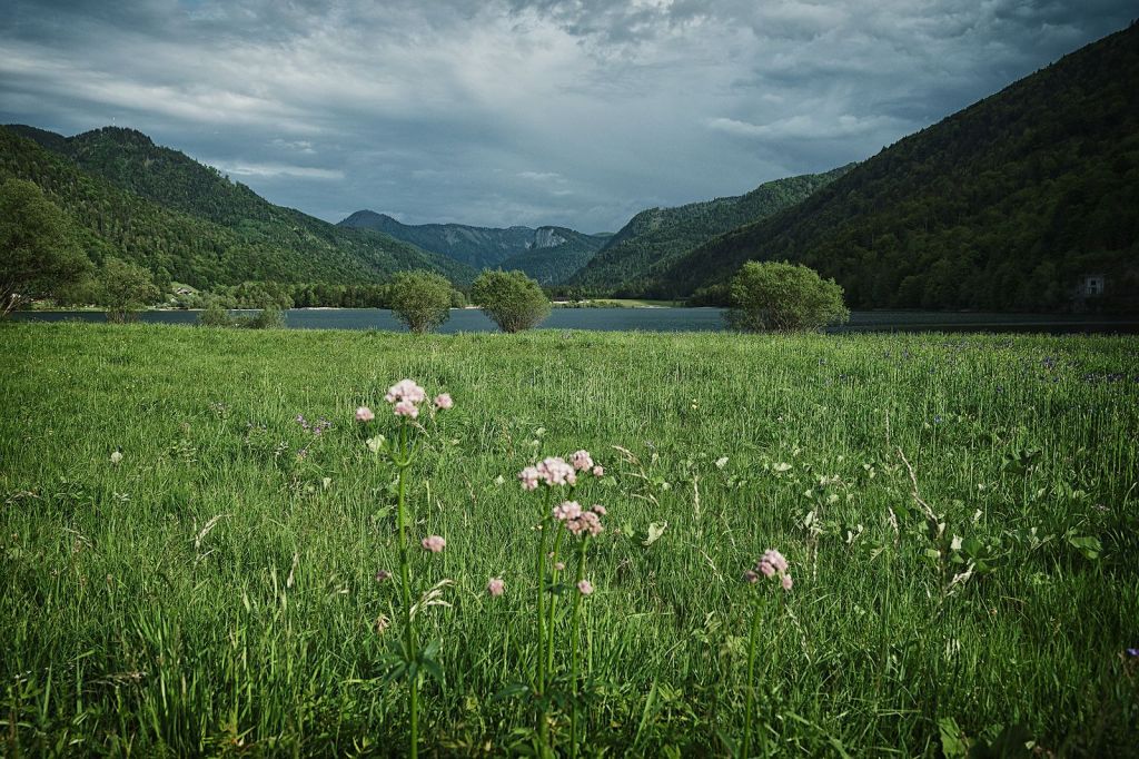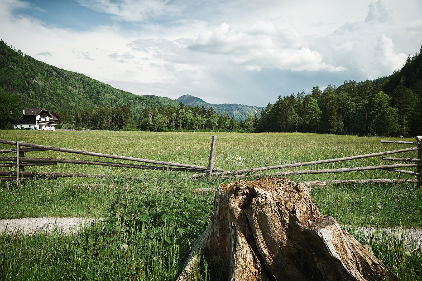 Das letzte Stück des Rundweges führt wieder an weiten Wiesen vorbei mit toller Aussicht über den See und die Bergwelt der Osterhorngruppe.