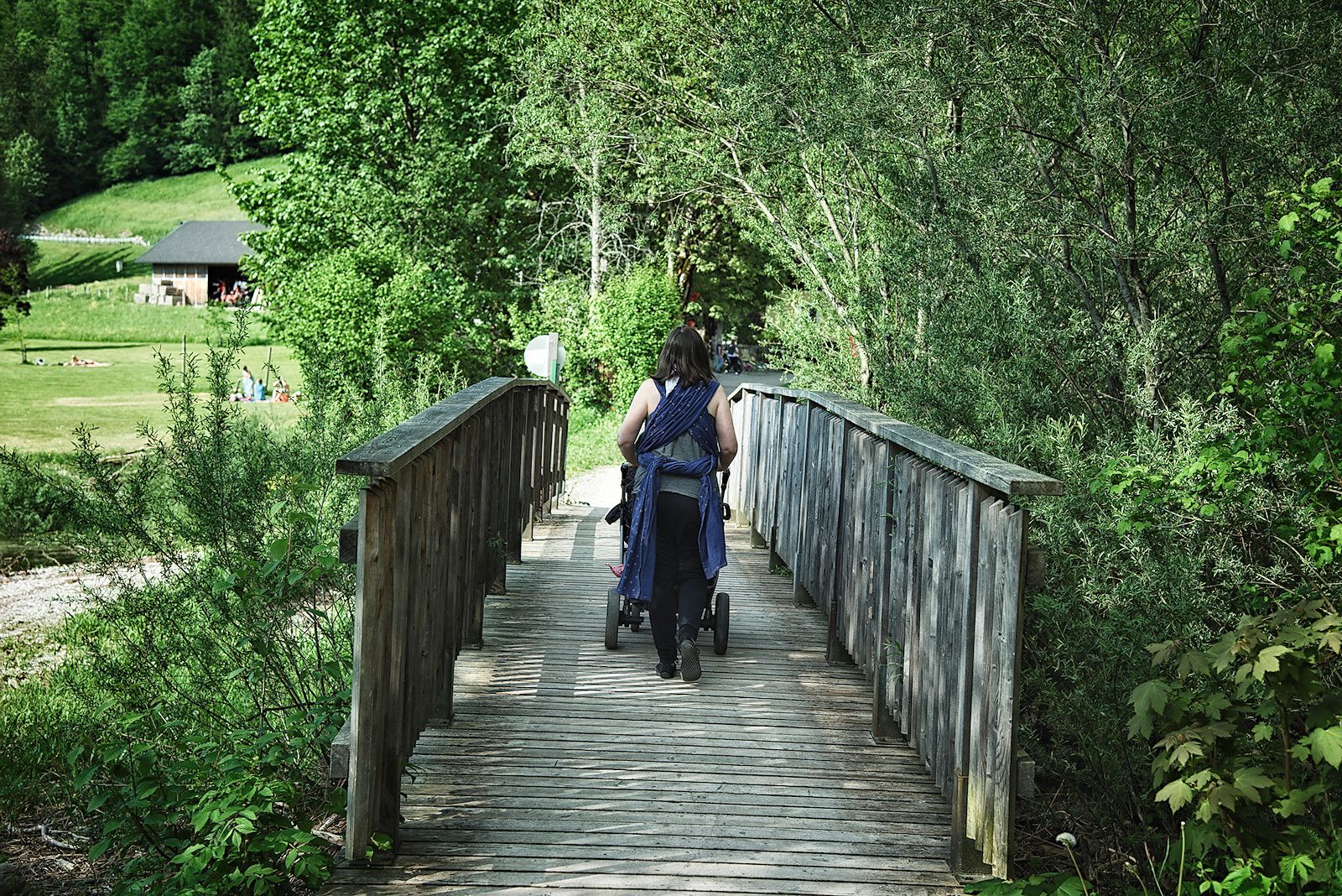 Vom großen, kostenpflichtigen Wanderparkplatz an der Seestraße in Vordersee (Tagesticket € 4,-) brechen wir auf. 💡 Ebenso kann man aber auch beim Badeplatz Hirschpoint starten! Auf der breiten Holzbrücke rollen wir den Kinderwagen über den Brunnbach und erreichen bald den natürlichen Abfluss des Hintersees, überspannt von einer ziemlich massiven Holzbrücke. Diese ist schon etwas marode und einige der dicken Balken sind notdürftig geflickt. Aber am Parkplatz liegt bereits ein ganzer Stapel neuer Balken bereit, die Brücke wird wohl demnächst saniert werden.