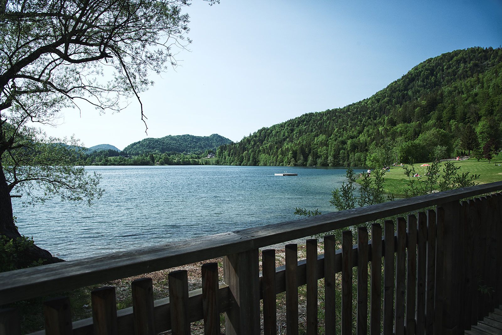 Nach dem Badeplatz biegen wir links ab und wandern nun – wiederum durch Wald – am Ostufer entlang. Immer wieder bieten sich zwischen den Bäumen Ausblicke auf den See, an manchen davon laden auch Sitzbänke zum Verweilen ein.