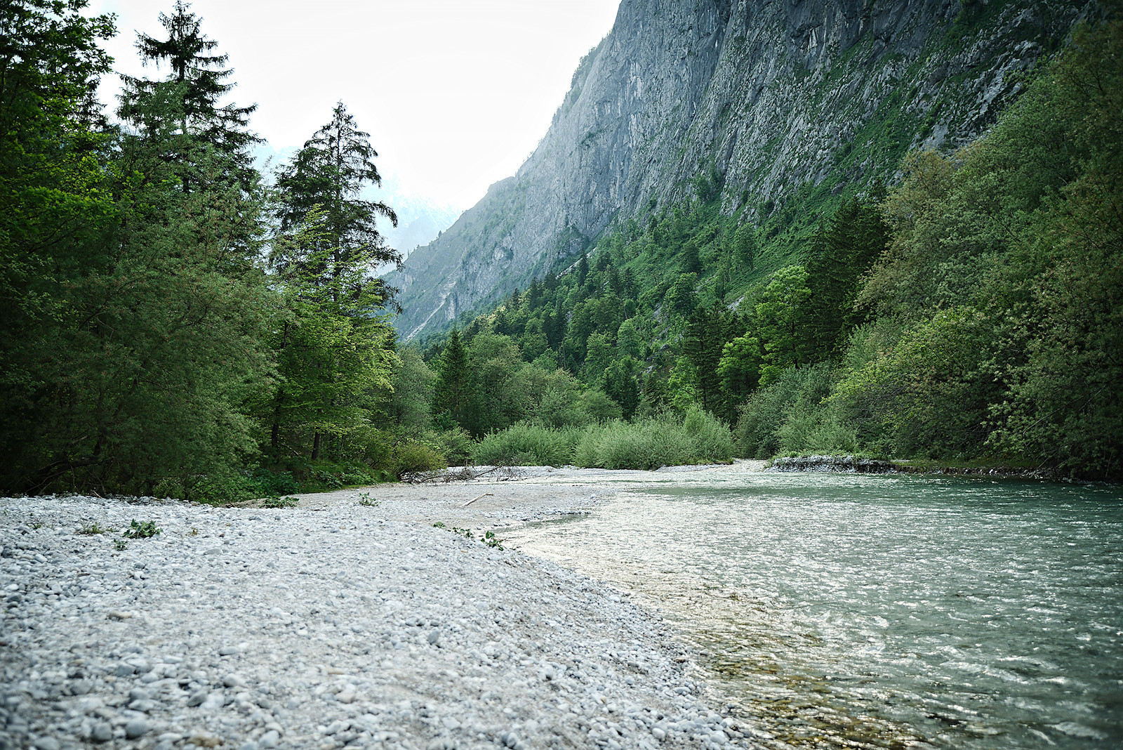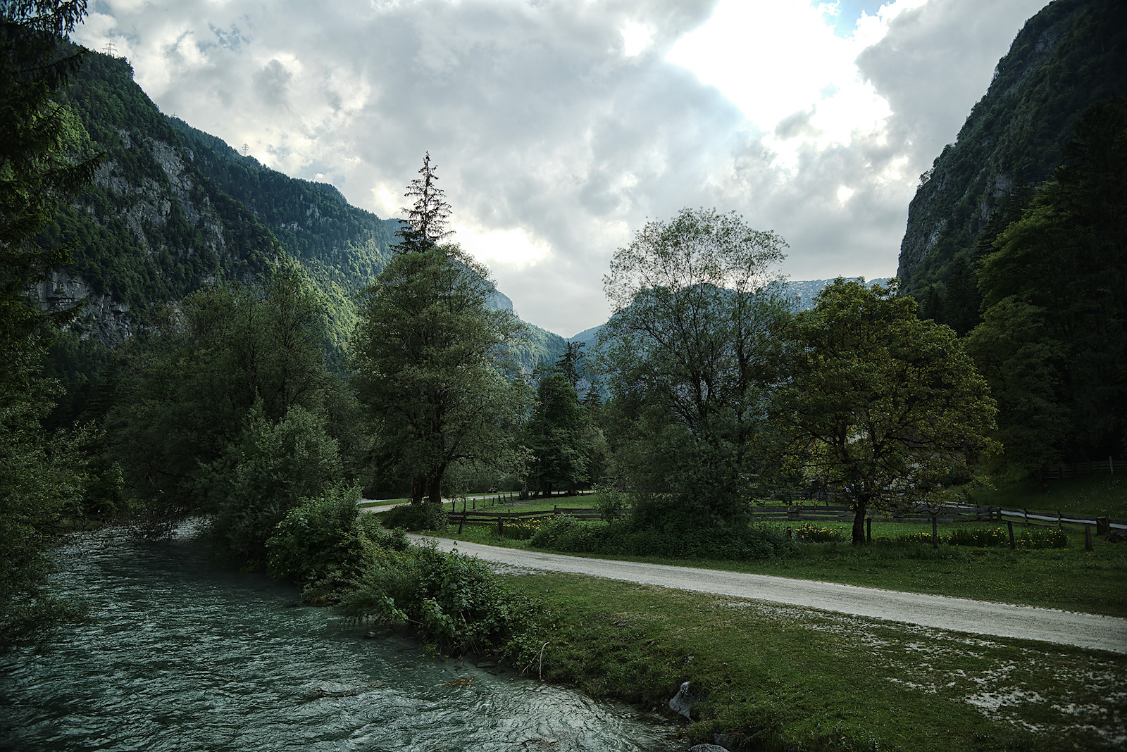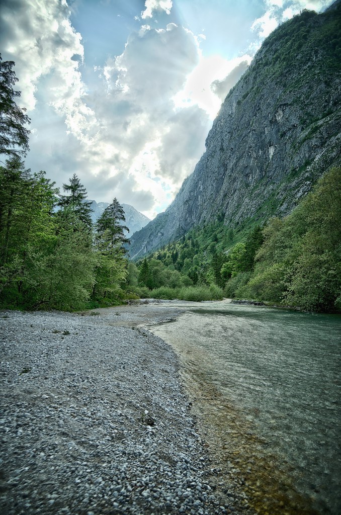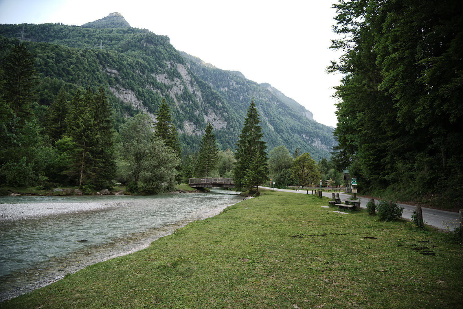 Nach etwa einem halben Kilometer stehen wir am Torrener Bach und blicken hinein in das Tal. Für mich ist es immer wieder ein atemberaubender Anblick: Die annähernd senkrecht aufragenden Felswände zu beiden Seiten, dazwischen die sanfte Tallandschaft mit dem türkisfarbenen Bach und der malerischen Holzbrücke, die ihn überspannt.