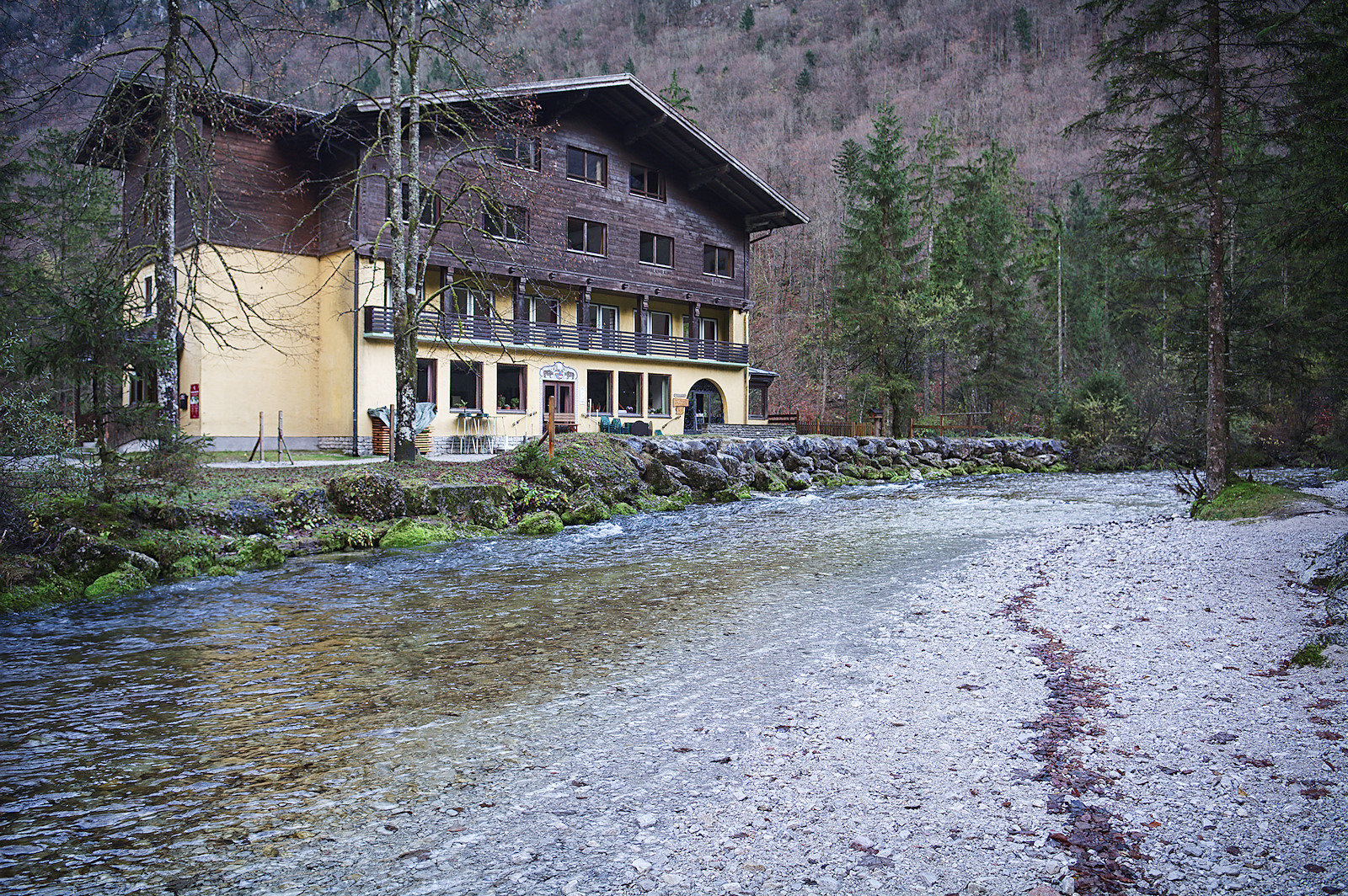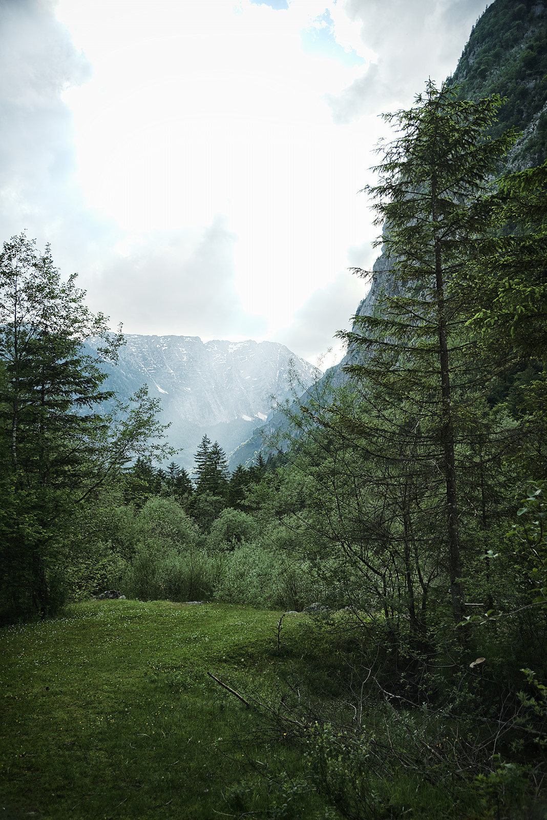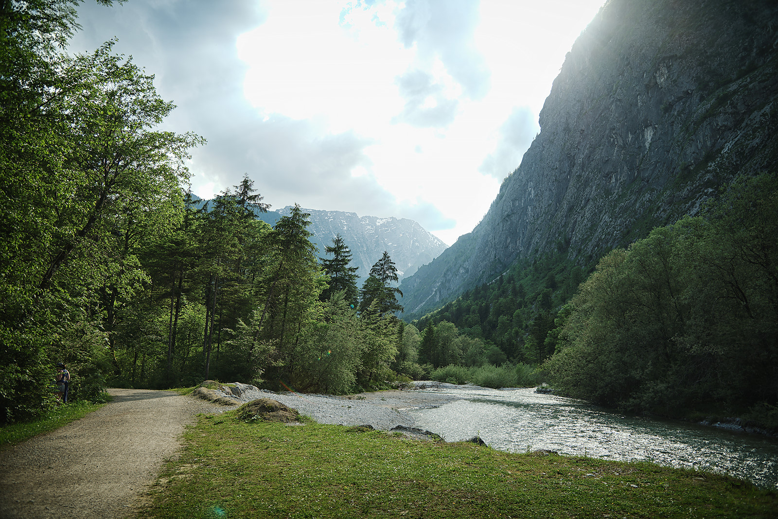 Nach etwa einem halben Kilometer stehen wir am Torrener Bach und blicken hinein in das Tal. Für mich ist es immer wieder ein atemberaubender Anblick: Die annähernd senkrecht aufragenden Felswände zu beiden Seiten, dazwischen die sanfte Tallandschaft mit dem türkisfarbenen Bach und der malerischen Holzbrücke, die ihn überspannt.