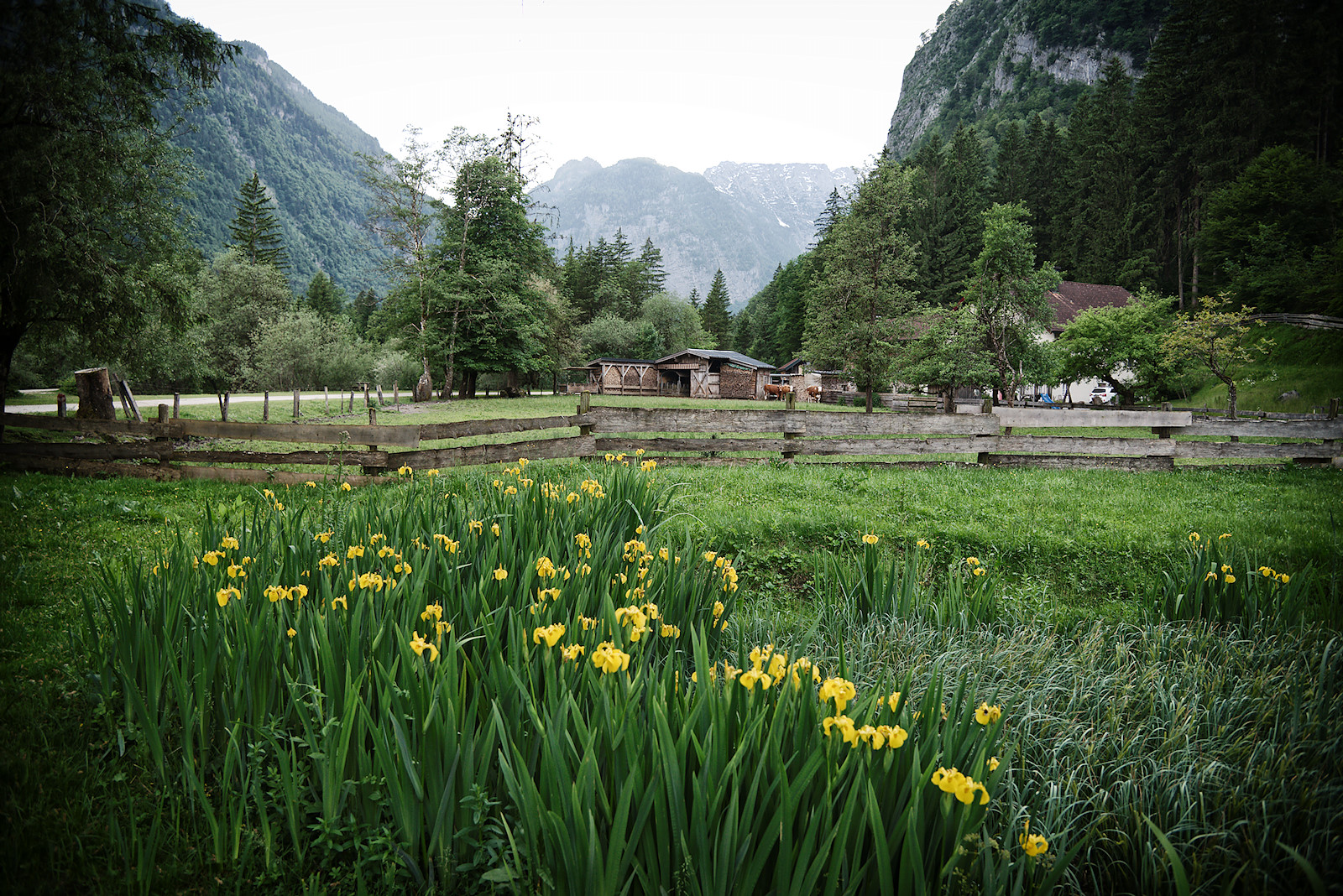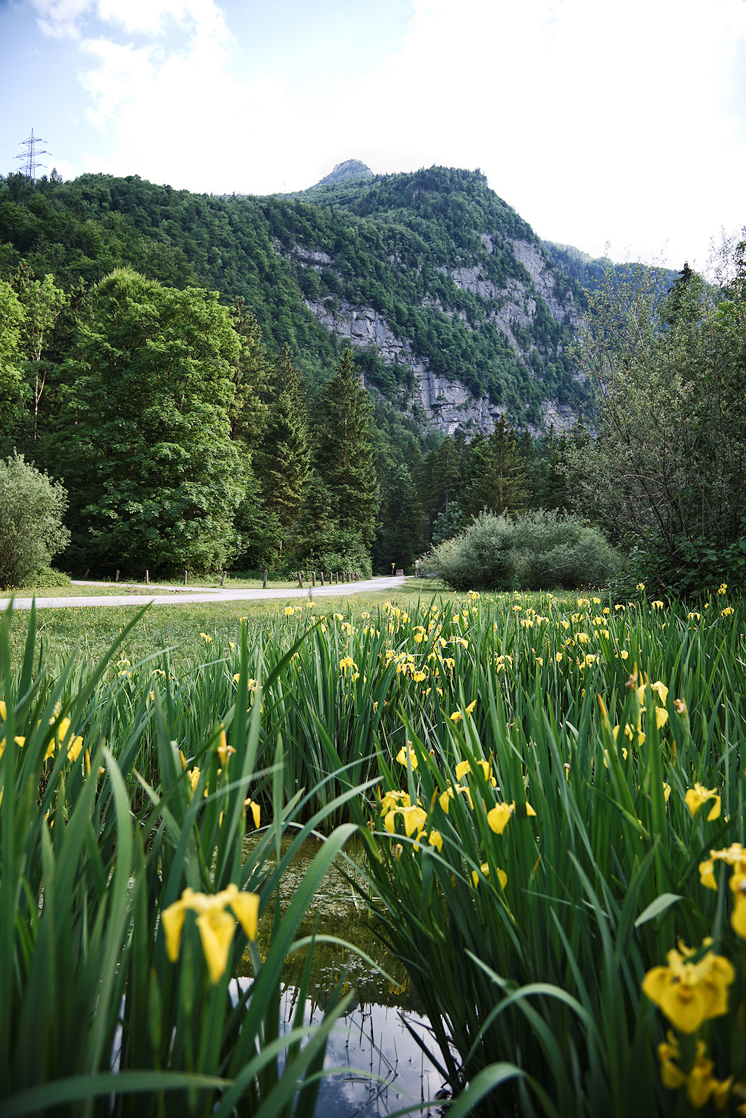 Wir wandern über die Brücke und biegen an der nächsten Möglichkeit rechts ab. Dieser Weg wird uns am Bach entlang zu den Bluntauseen führen. Doch bevor es so weit ist, birgt eine kleine Lacke neben der Abzweigung ein großes Highlight: Vor kurzem habe ich die Sibirische Schwertlilie am Faistenauer Hintersee gezeigt.
