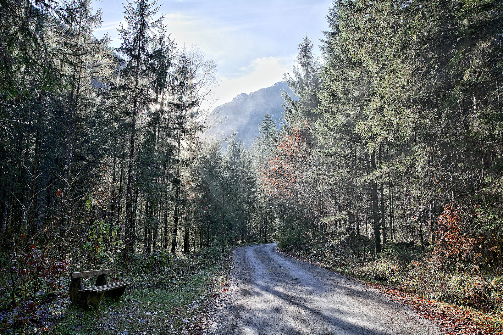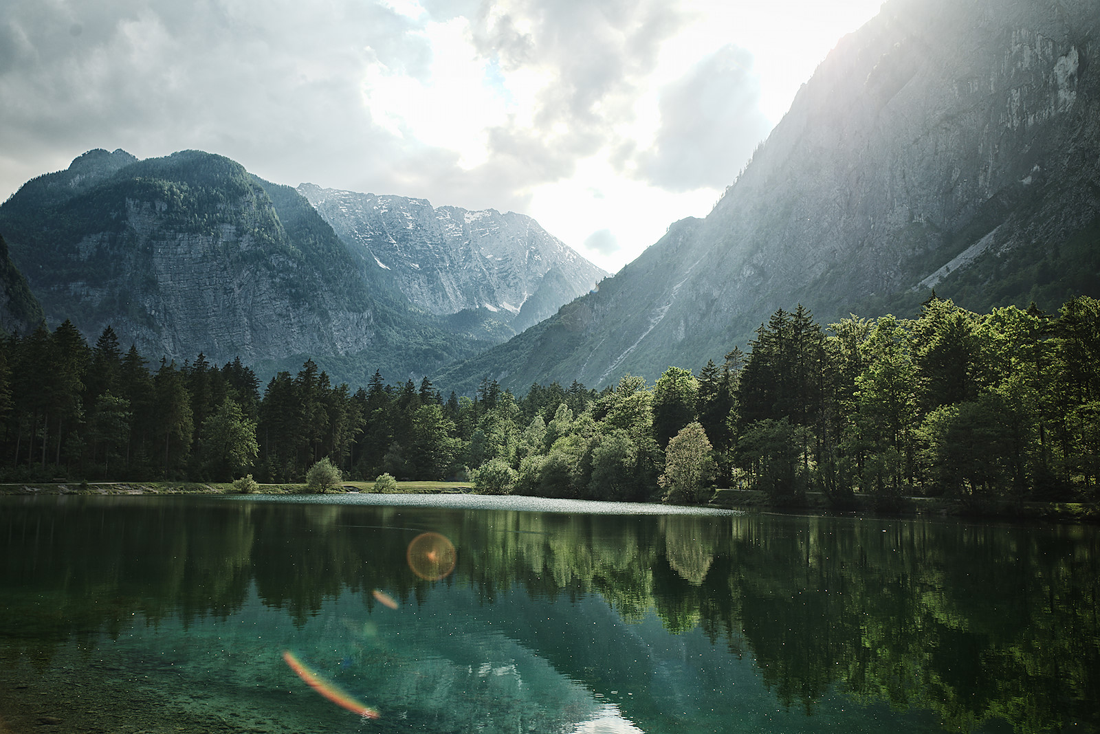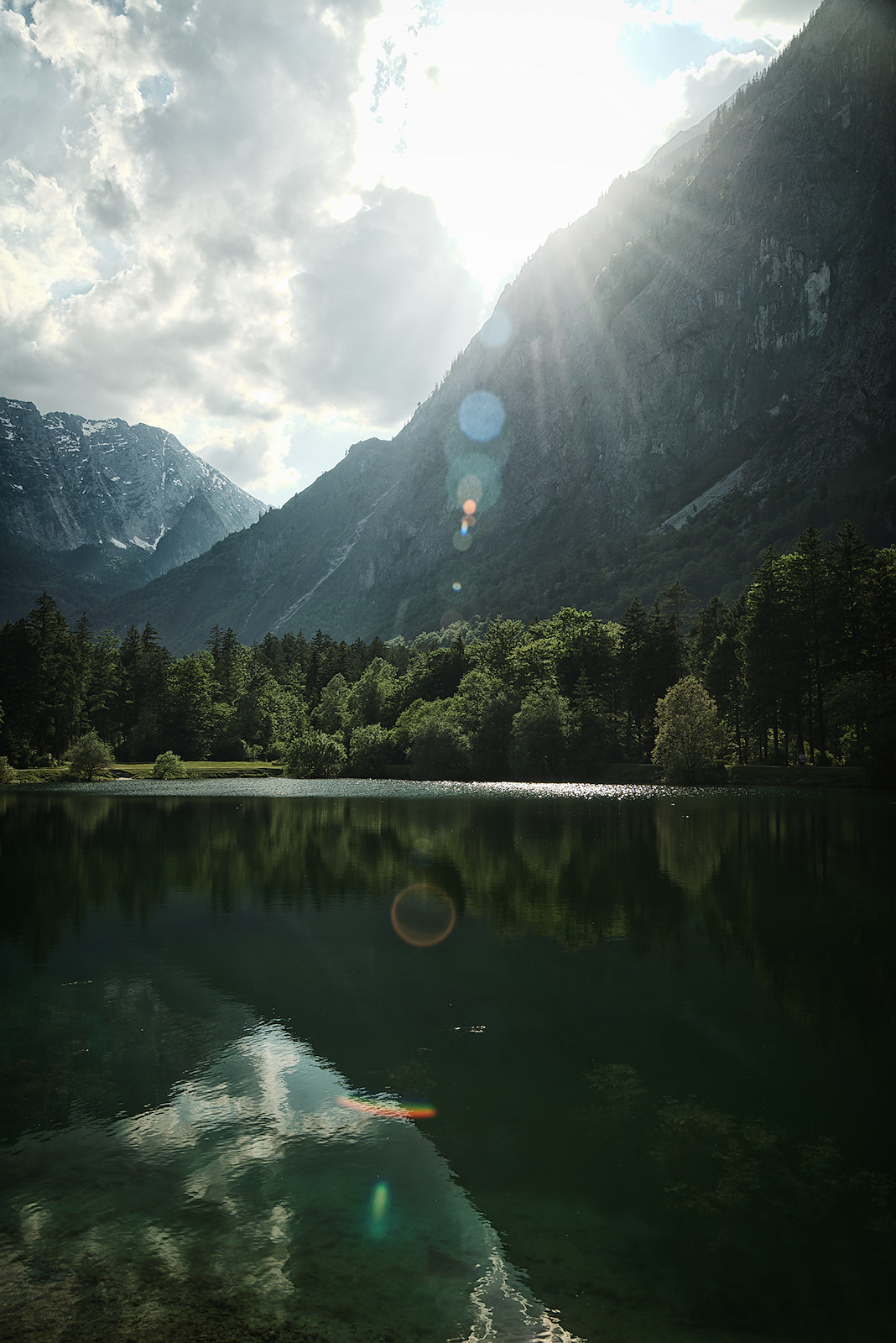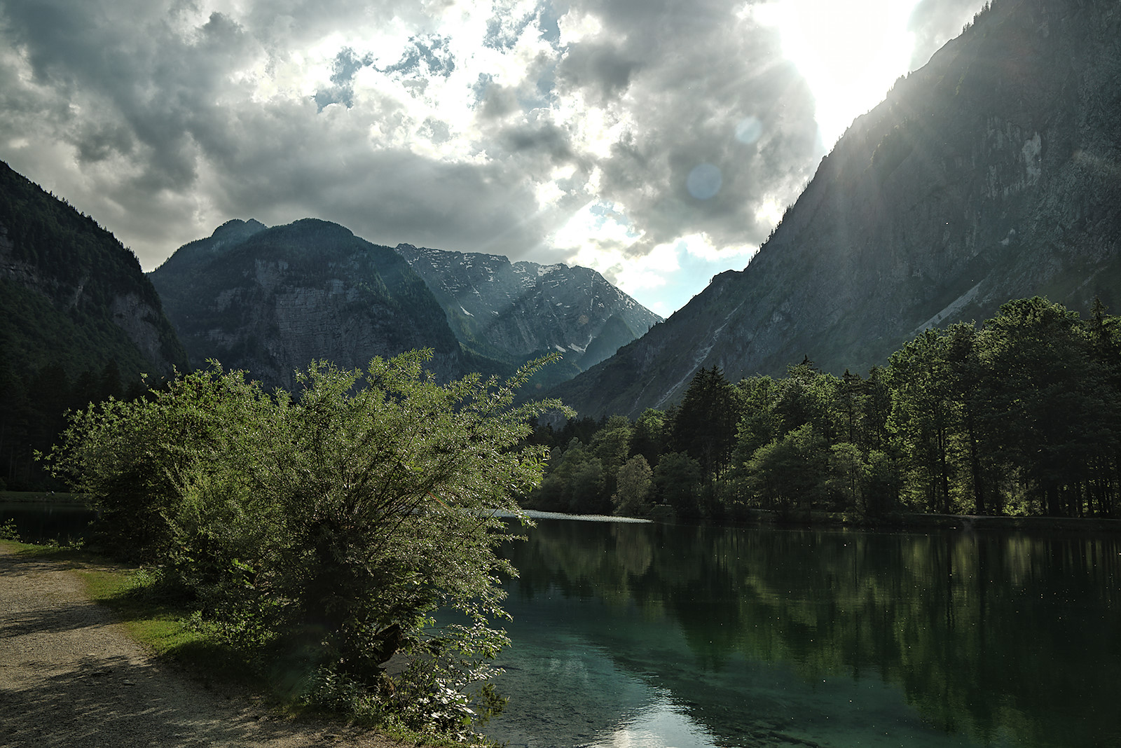 Am Oberen Bluntausee tauchen wir aus dem Wald wieder auf und stehen vor der nächsten großartigen Kulisse. Die tiefstehende Sonne sorgt im Wechselspiel mit einigen Wolken für eine mystische Stimmung. Eine Stillpause auf einer schattigen Bank muss natürlich auch noch sein. 😉