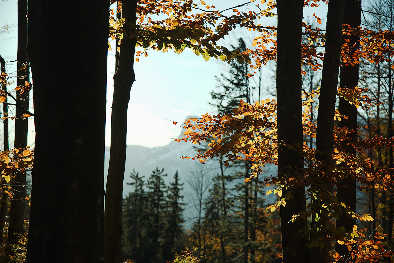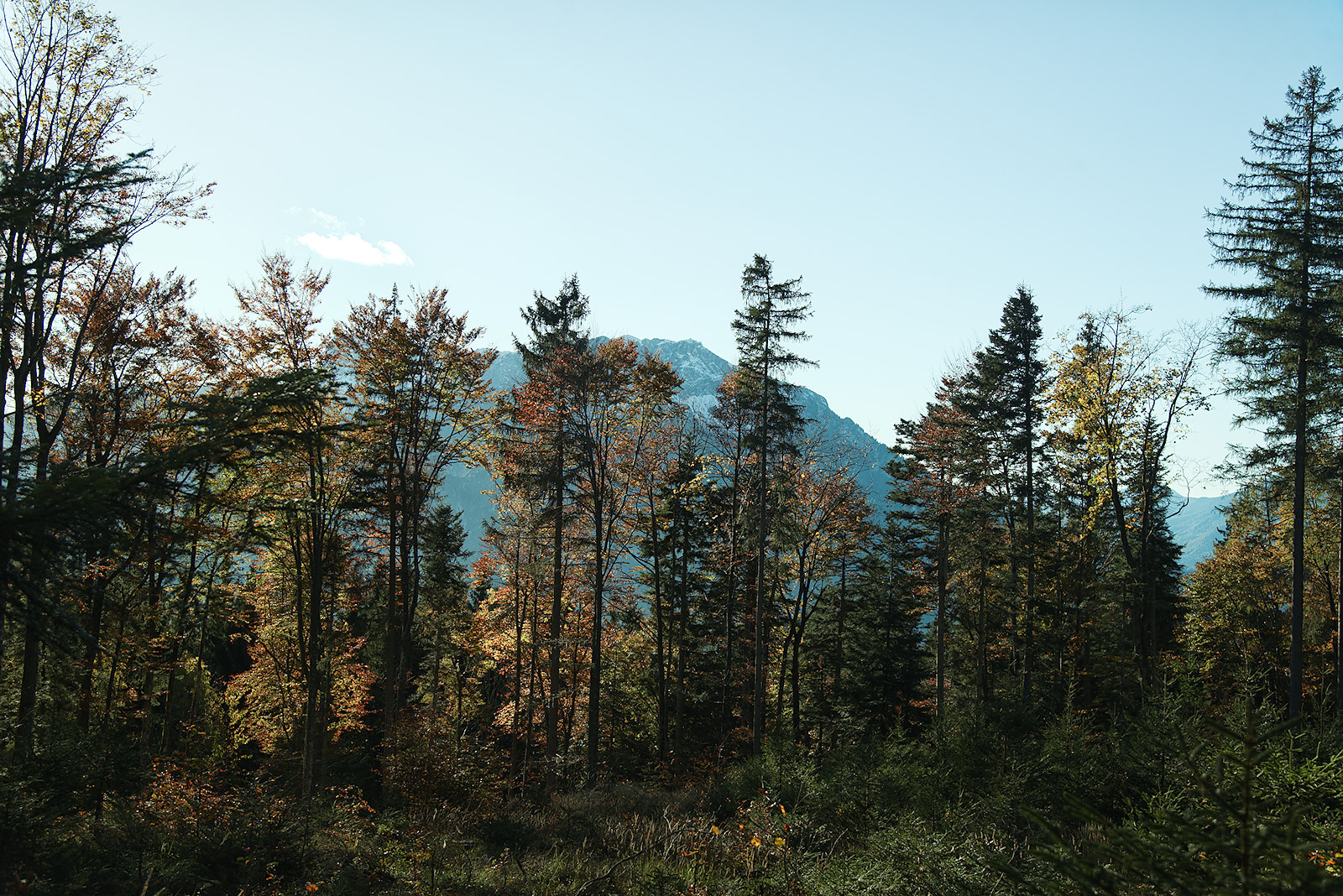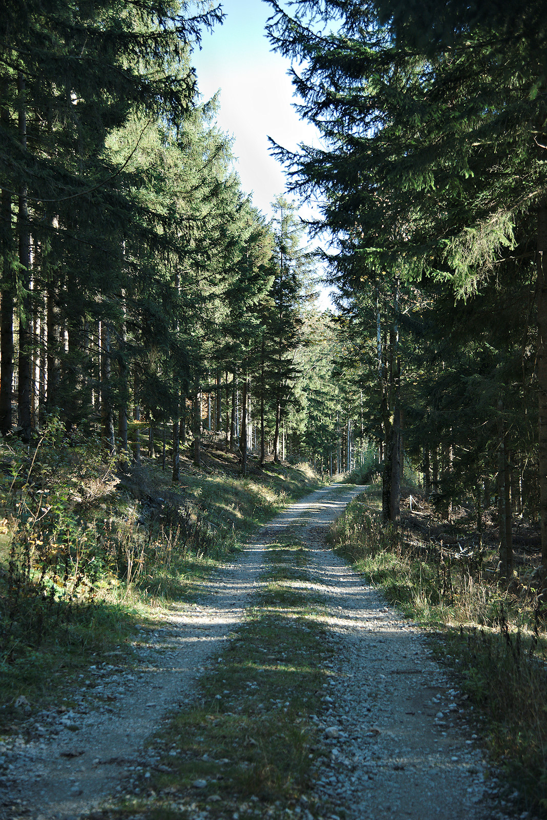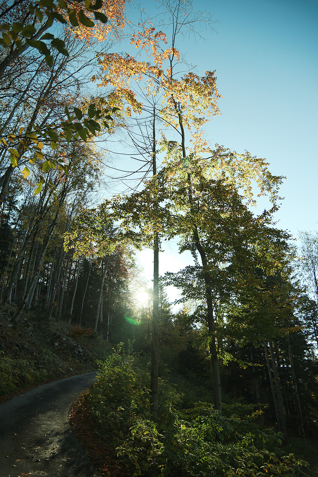 Weiter geht es auf der Forststraße in Richtung Hubertuskapelle. Nach einigen Minuten sollte man eine beschilderte Abzweigung auf einen Waldweg allerdings nicht verpassen, denn die Forststraße führt laut Karte nirgendwo hin. Der Waldweg hingegen führt leicht bergauf zu einer weiteren Forststraße. Nach rechts könnte ich dieser nun zur Hubertuskapelle folgen, oder nach links zur Erentrudisalm zurück wandern. Einen richtigen Plan habe ich zu diesem Zeitpunkt noch nicht, denn meine Mission für diesen Tag lautete nur, den Herbstwald zu fotografieren. Allerdings zieht es mich eher nach oben, als hinunter zur Hubertuskapelle.