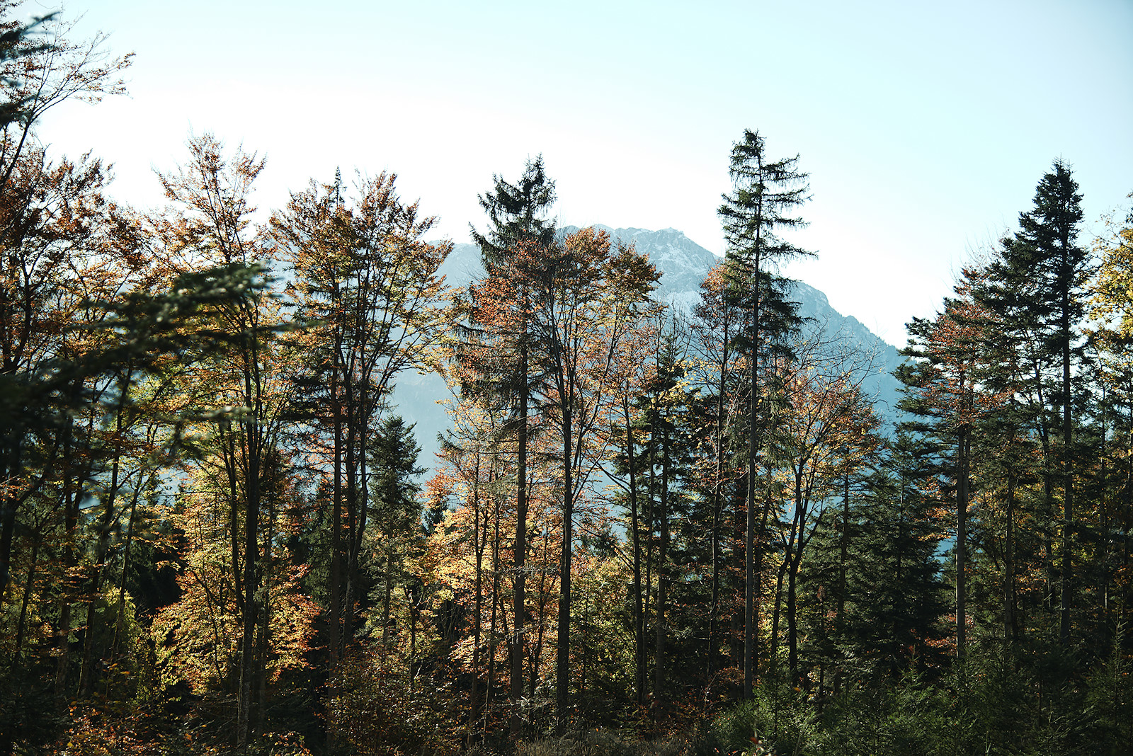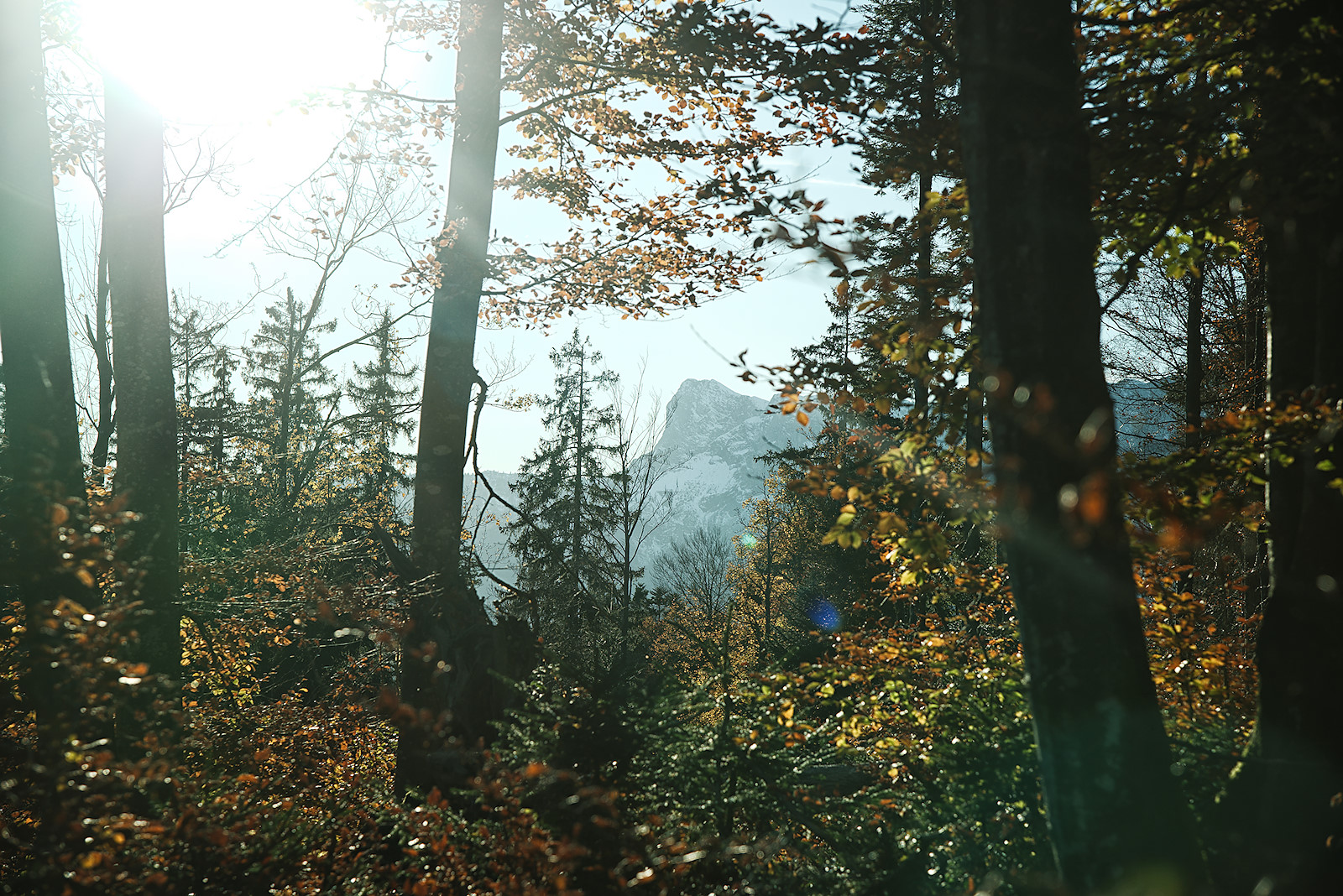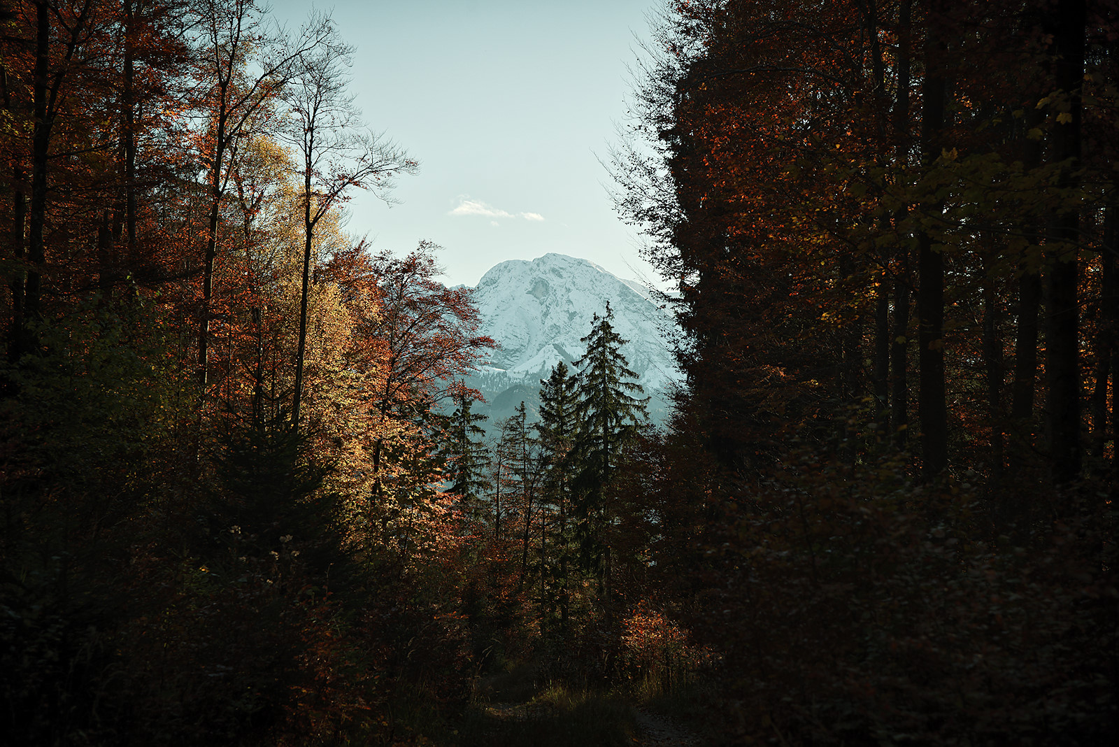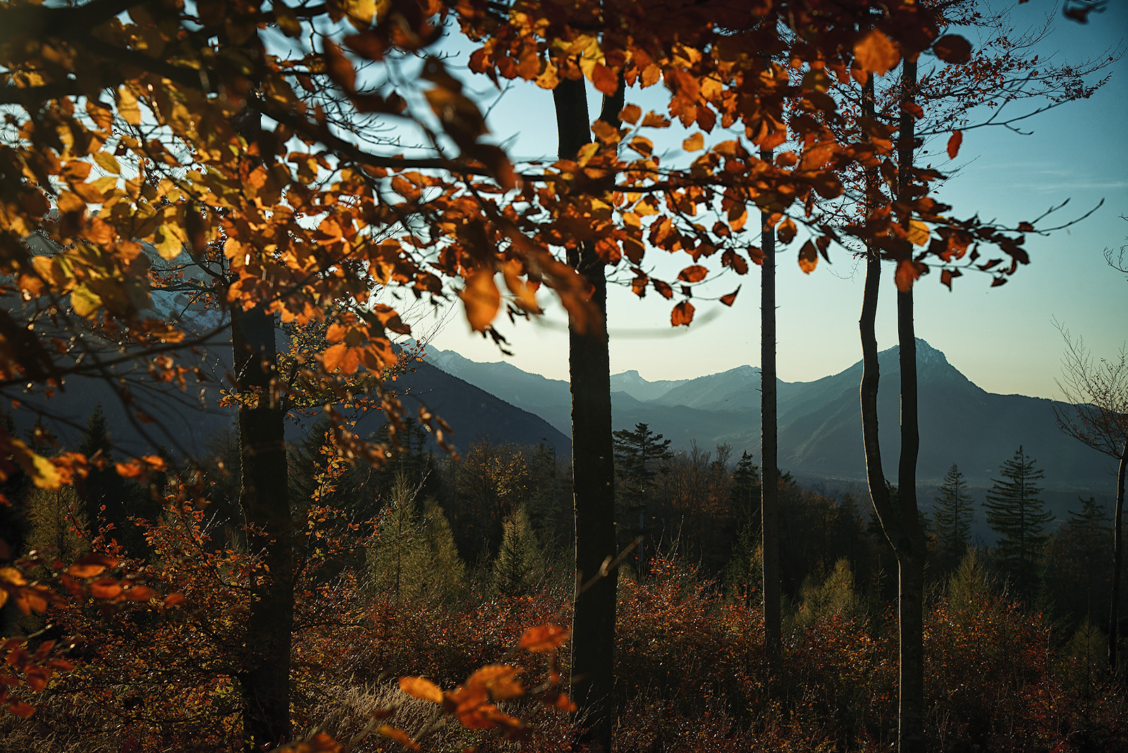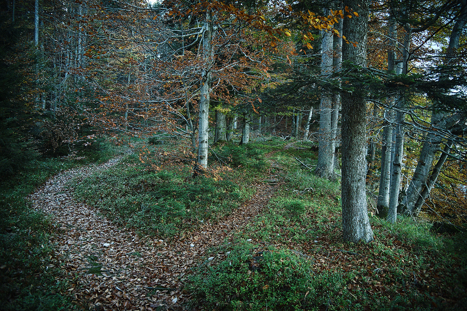 Weiter geht es auf der Forststraße in Richtung Hubertuskapelle. Nach einigen Minuten sollte man eine beschilderte Abzweigung auf einen Waldweg allerdings nicht verpassen, denn die Forststraße führt laut Karte nirgendwo hin. Der Waldweg hingegen führt leicht bergauf zu einer weiteren Forststraße. Nach rechts könnte ich dieser nun zur Hubertuskapelle folgen, oder nach links zur Erentrudisalm zurück wandern. Einen richtigen Plan habe ich zu diesem Zeitpunkt noch nicht, denn meine Mission für diesen Tag lautete nur, den Herbstwald zu fotografieren. Allerdings zieht es mich eher nach oben, als hinunter zur Hubertuskapelle.