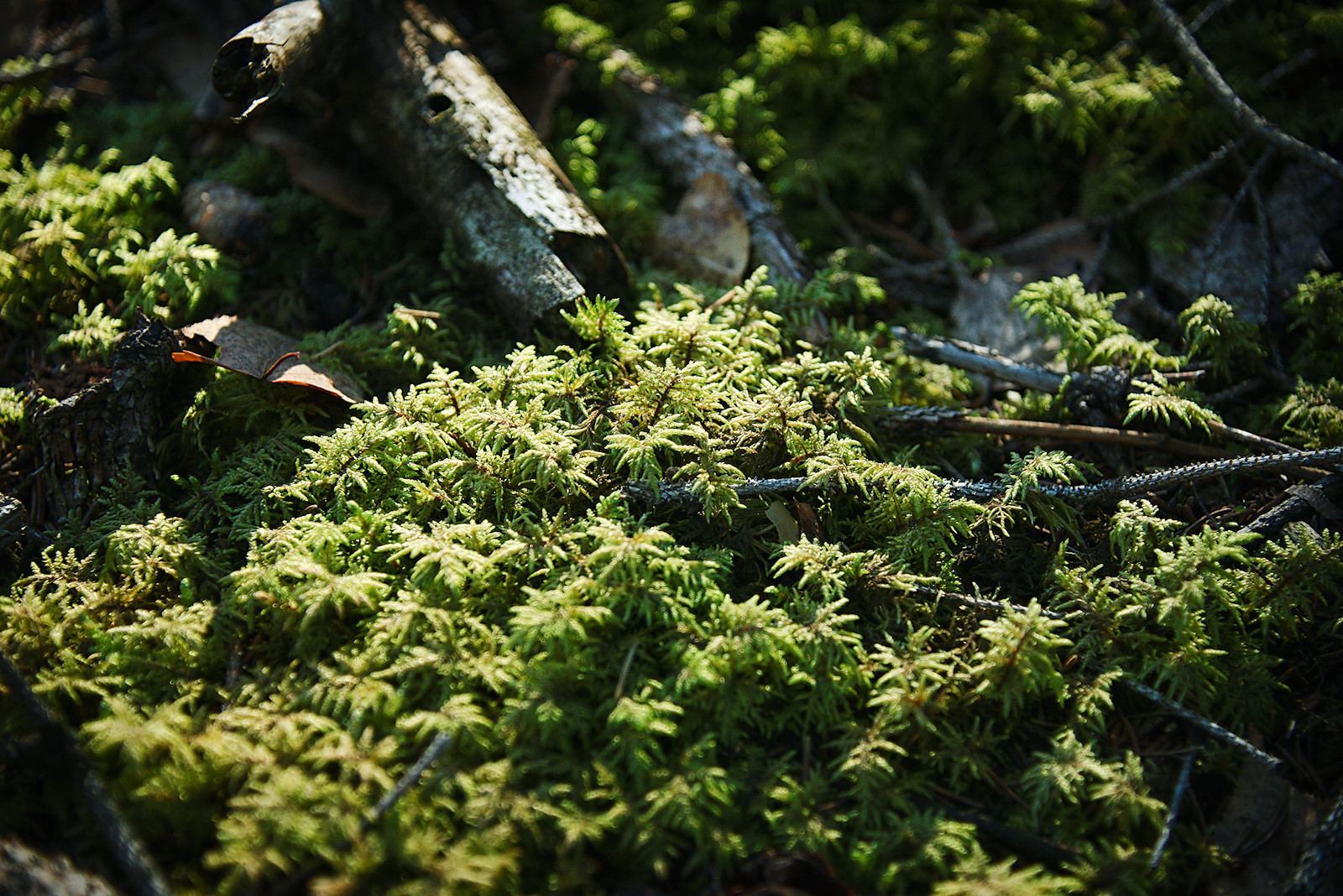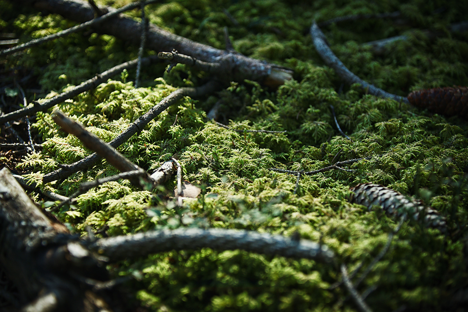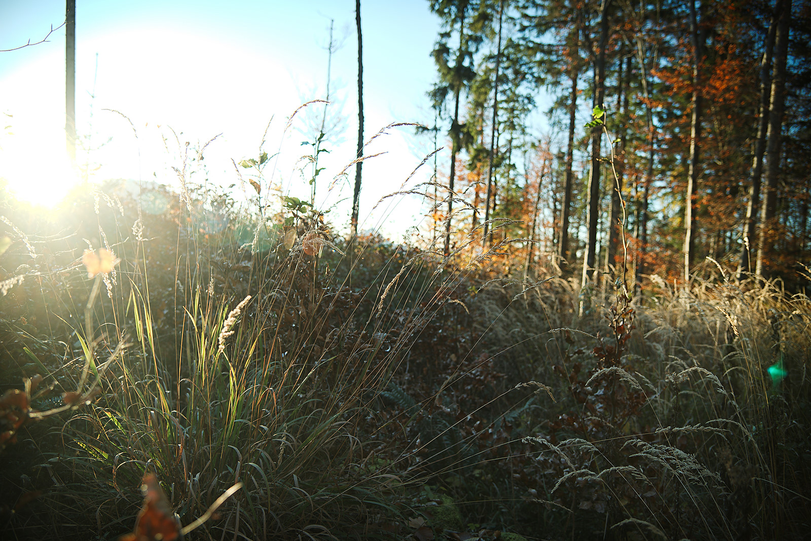 Auf der anderen Seite führt mich ein sich nunmehr deutlich abzeichnender Trampelpfad hinunter in Richtung Sonne. Bald treffe ich auf eine kleine Kahlfläche in der vertrocknete Riedgräser in der tiefstehenden Sonne leuchten. Die goldene Stunde taucht alles in ihr warmes Licht.
