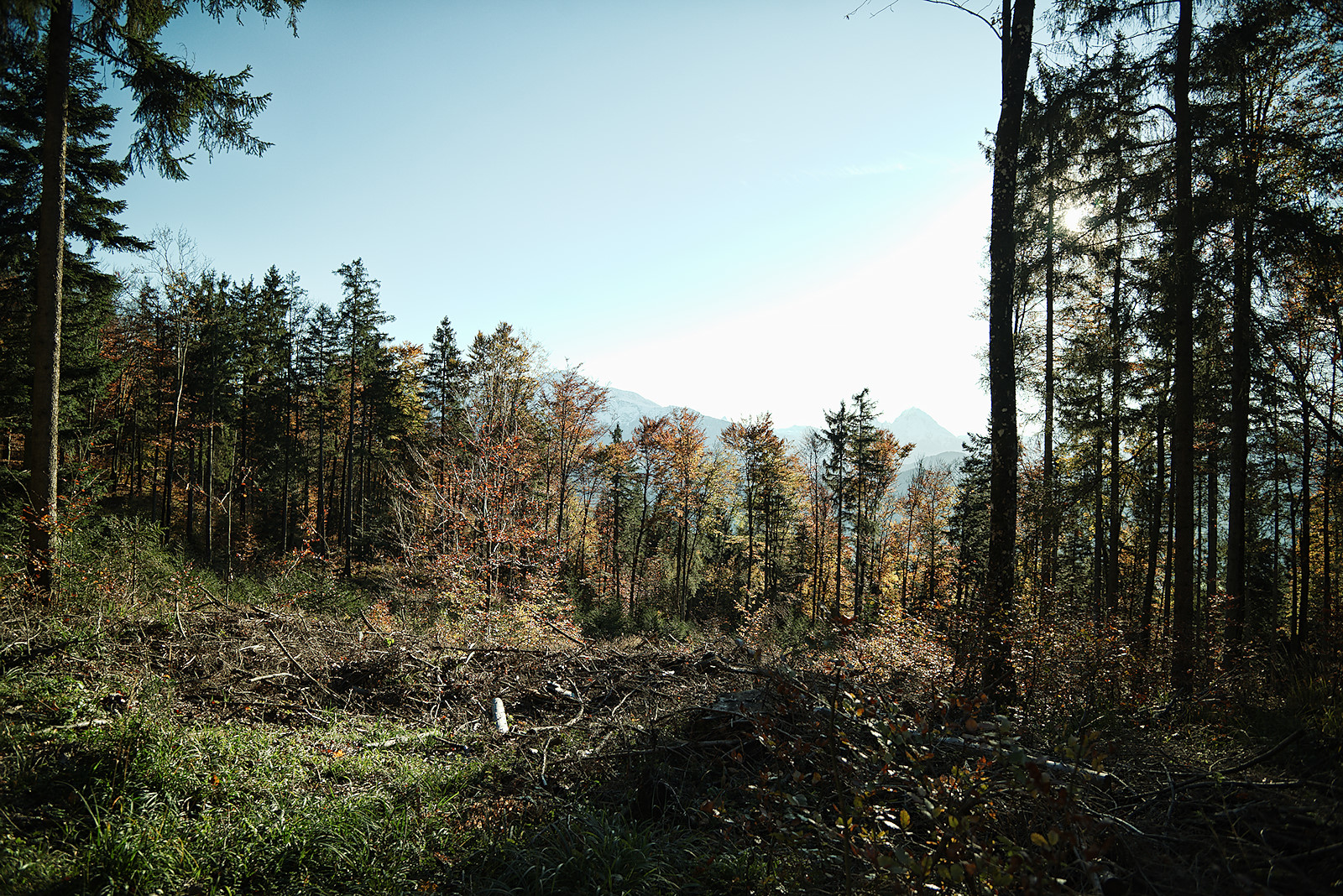 So folge ich dem – wie sich herausstellen sollte – einzigen noch verbliebenen offiziellen Wanderweg auf der Forststraße Richtung Erentrudisalm. Der Wald ist sehr licht und bietet immer wieder Ausblicke. Und so wäre ich spätestens 15 Minuten später schon wieder am Ausgangspunkt gestanden. Doch heute – so habe ich inzwischen beschlossen – möchte ich mich auf die Suche nach dem Mühlsteingipfel machen. Dieser ist irgendwo auf diesem Plateau im Wald versteckt. Vor vielen Jahren war ich schon einmal hier oben unterwegs, den Gipfel habe ich damals aber nicht gefunden. Seitdem hat sich technologisch ja einiges getan und so ist das GPS meines heutigen Handys doch wesentlich exakter, als jenes meines ersten Smartphones damals. Wenn es heute nicht gelingt, wann dann?