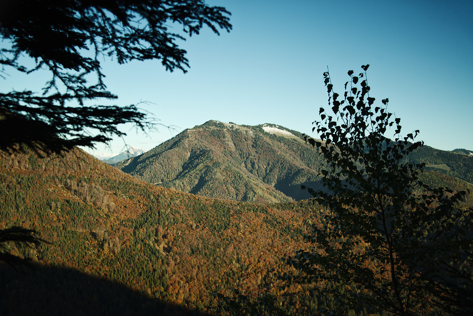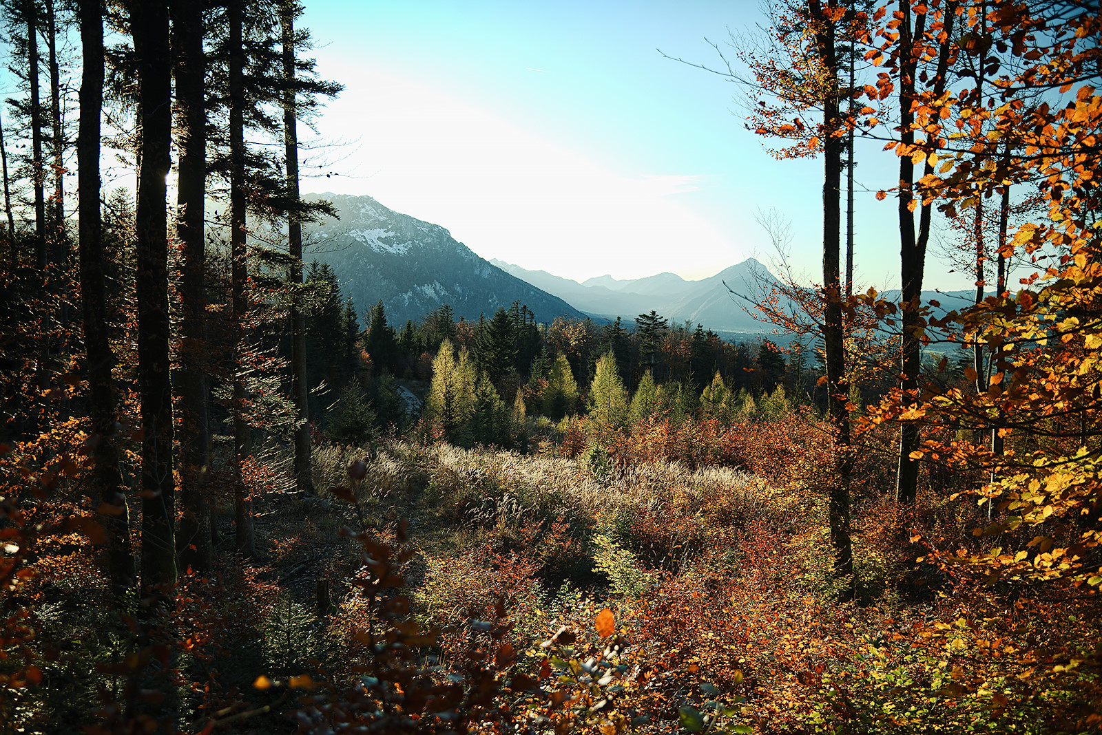 Vom Parkplatz wandere ich zunächst ein Stück die Straße bergab, biege dann aber gleich nach links in Richtung Schwarzenbergalm. Bald tauche ich erstmals für ein kurzes Stück in den bunten Wald ein, auch wenn ich mich immer noch auf Asphalt bewege. Bei der Schwarzenbergalm zweigt der Wanderweg auf eine Forststraße ab und führt auf eine Lichtung. Die Aussicht ist von dieser aber noch nicht berauschend. Dennoch lässt sich erkennen, dass die höheren Gipfel mittlerweile schneebedeckt sind.