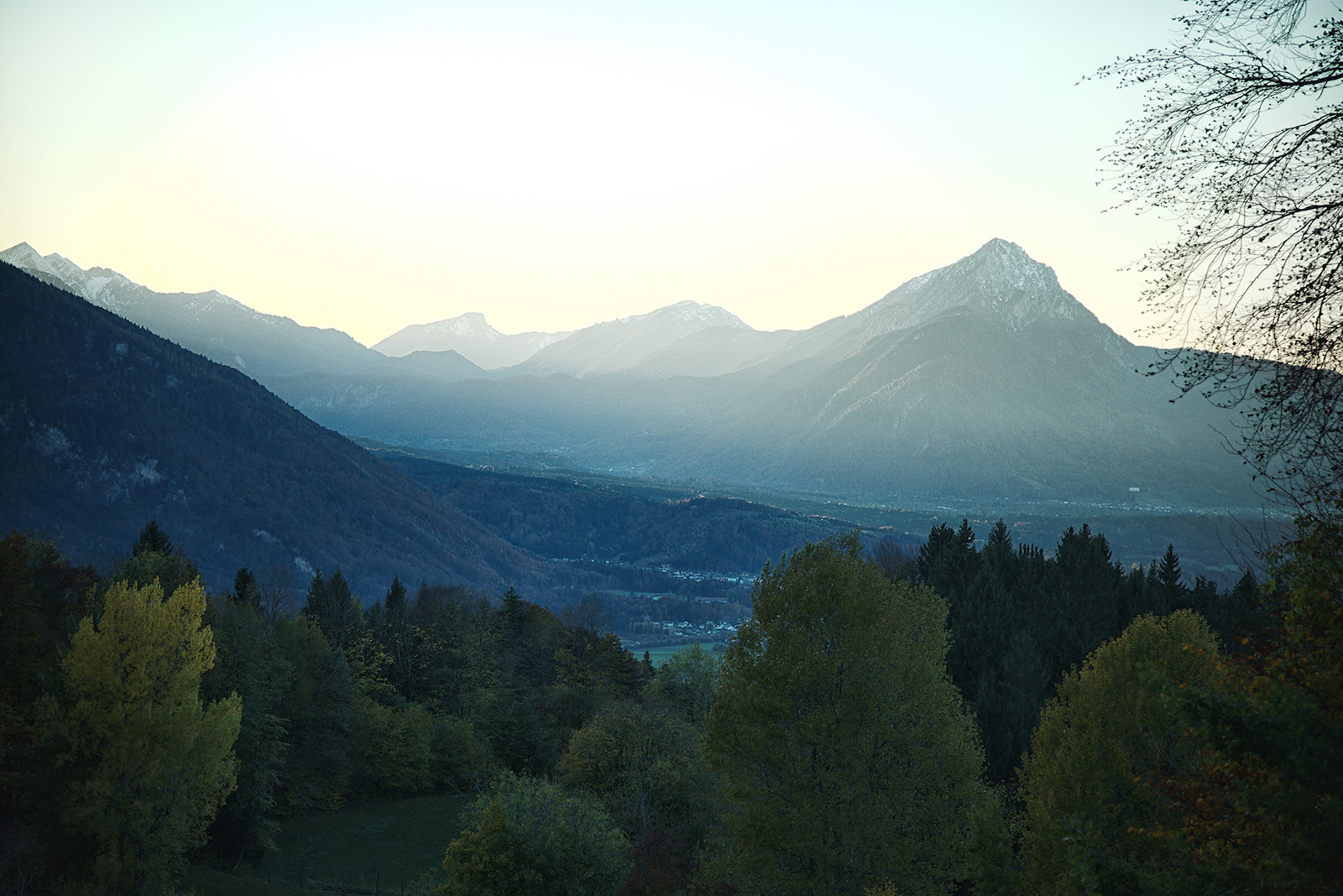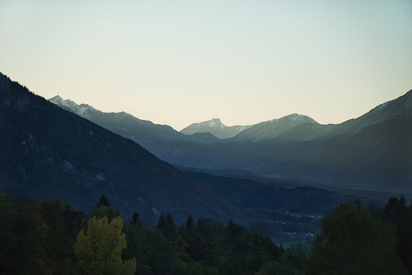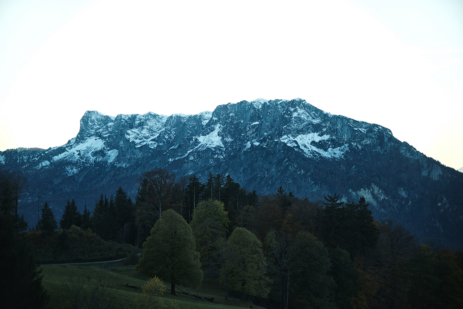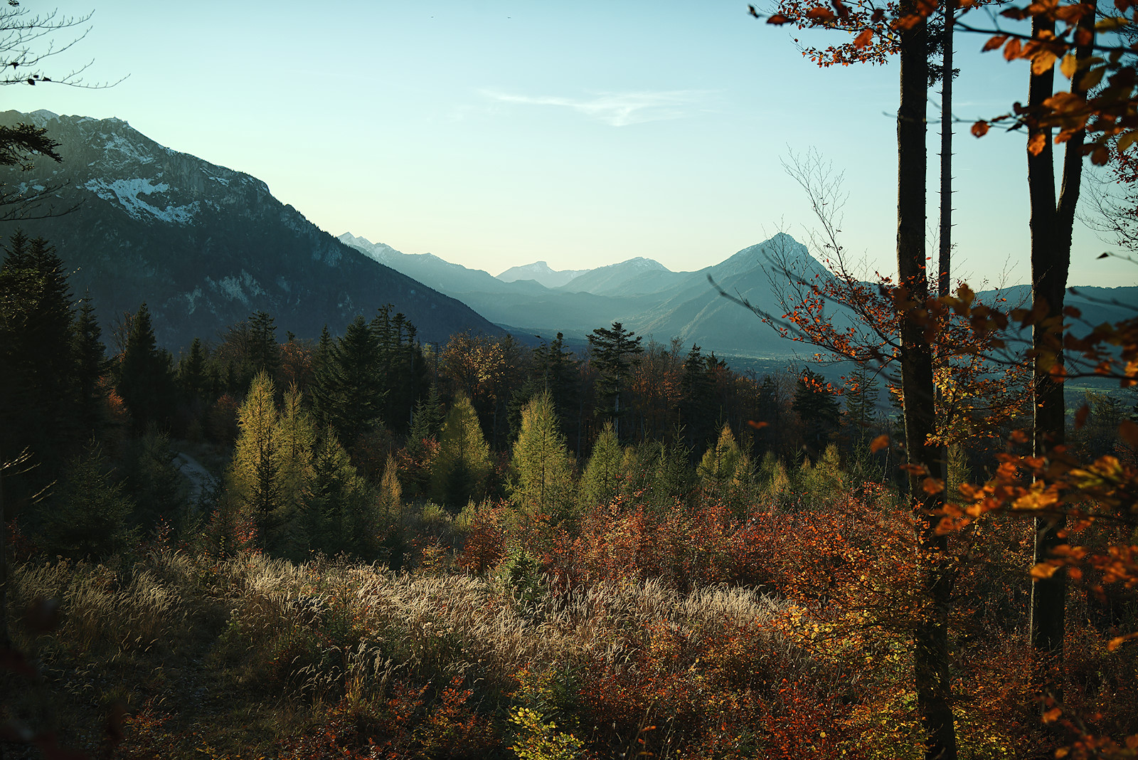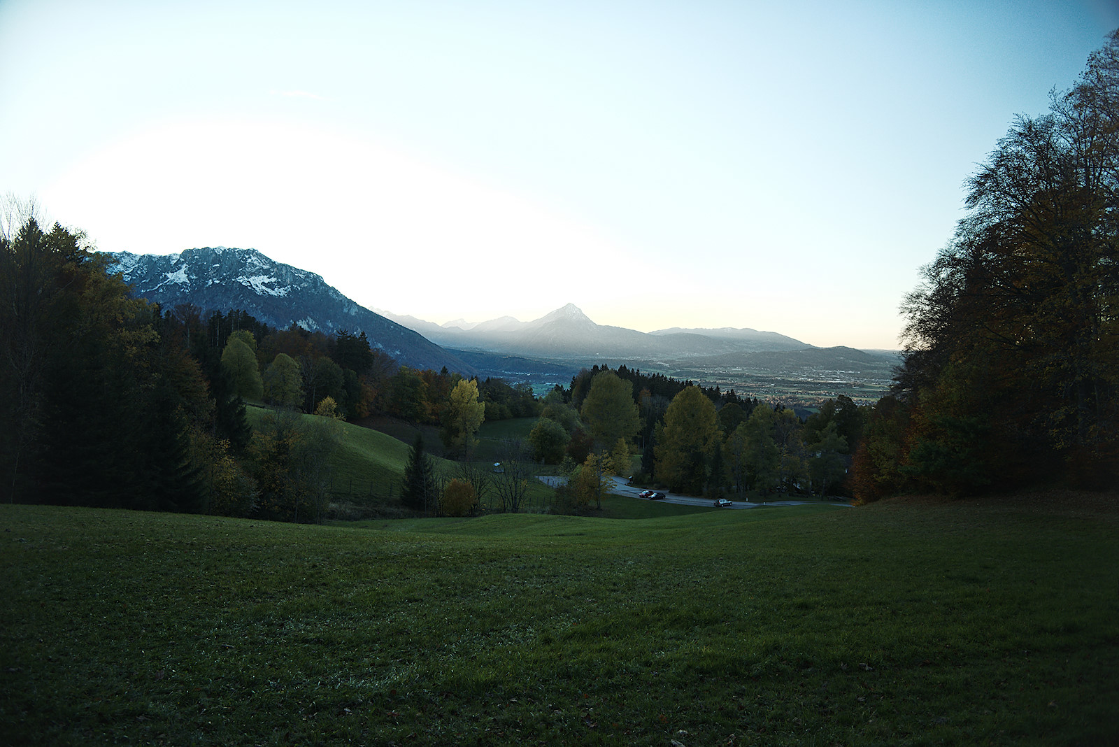 Dann dauert es nicht mehr lange und ich stoße – einem weiteren nicht in der Karte verzeichneten Karrenweg nach links folgend – wieder auf die markierte Forststraße, die ich vor langer Zeit verlassen habe. Die Sonne ist bereits hinter dem Untersberg im Westen verschwunden, als ich eine Wiese mit toller Aussicht oberhalb des Parkplatzes erreiche.