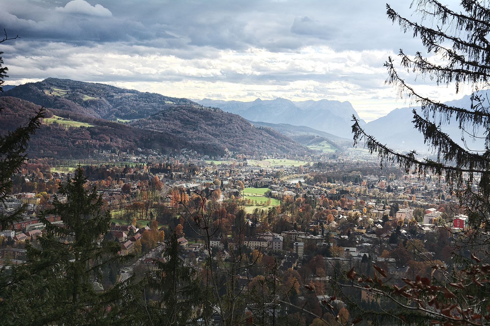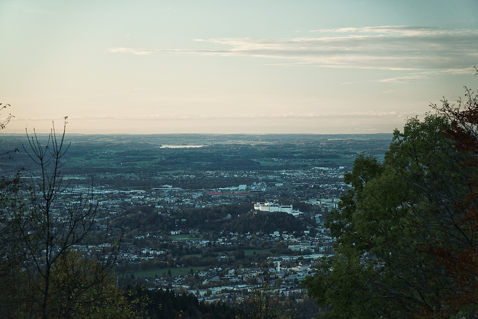 Kurz darauf stehe ich wieder am Parkplatz der Erentrudisalm, von welchem sich noch ein kurzer Blick auf die bereits im Schatten liegende Stadt Salzburg bietet.