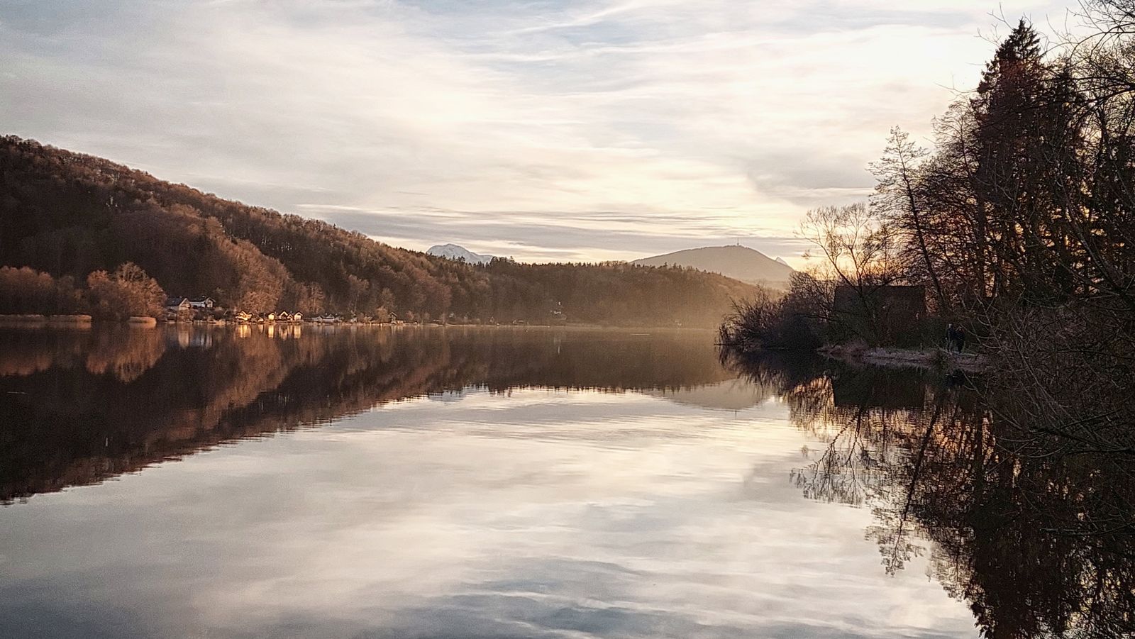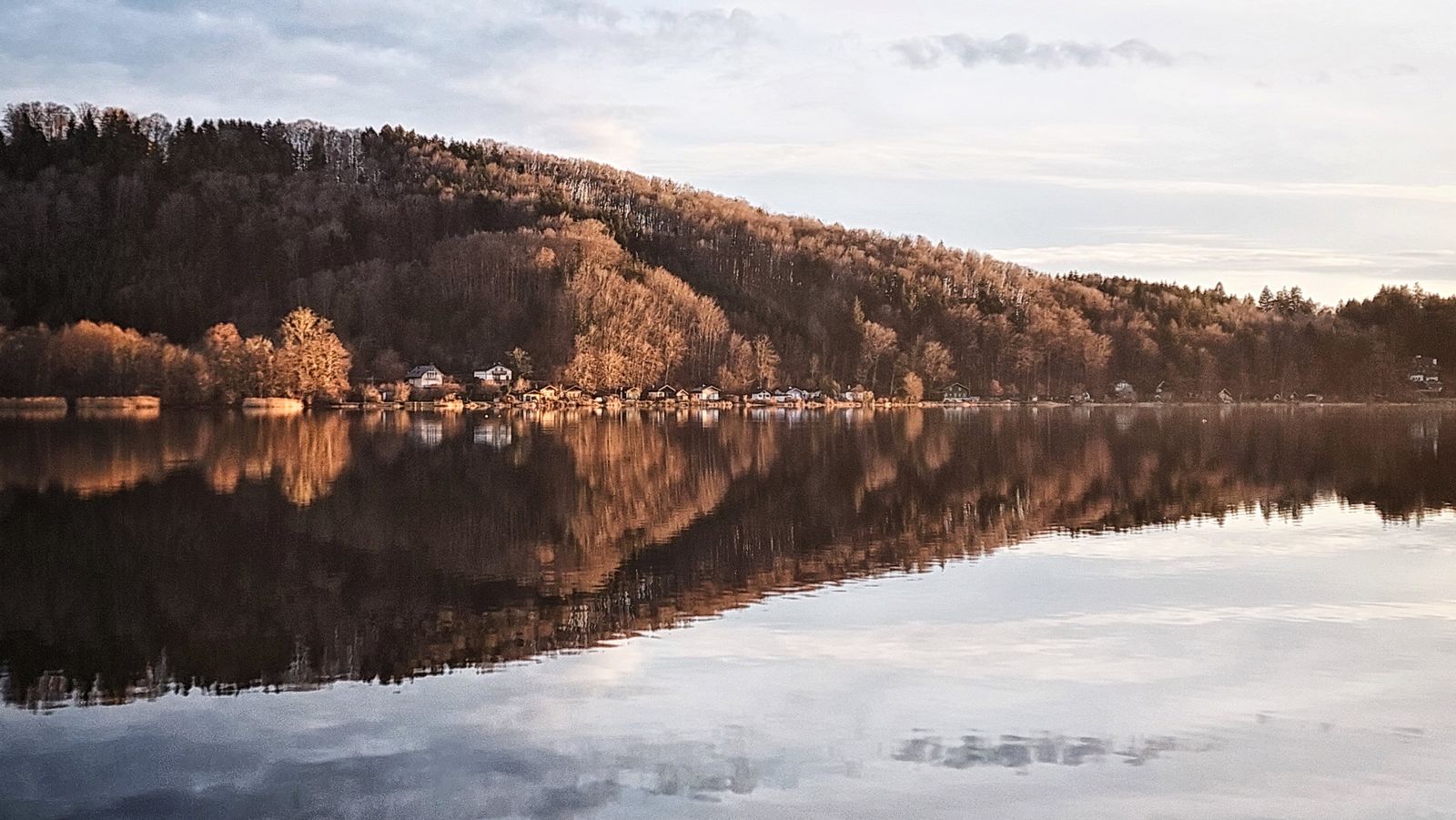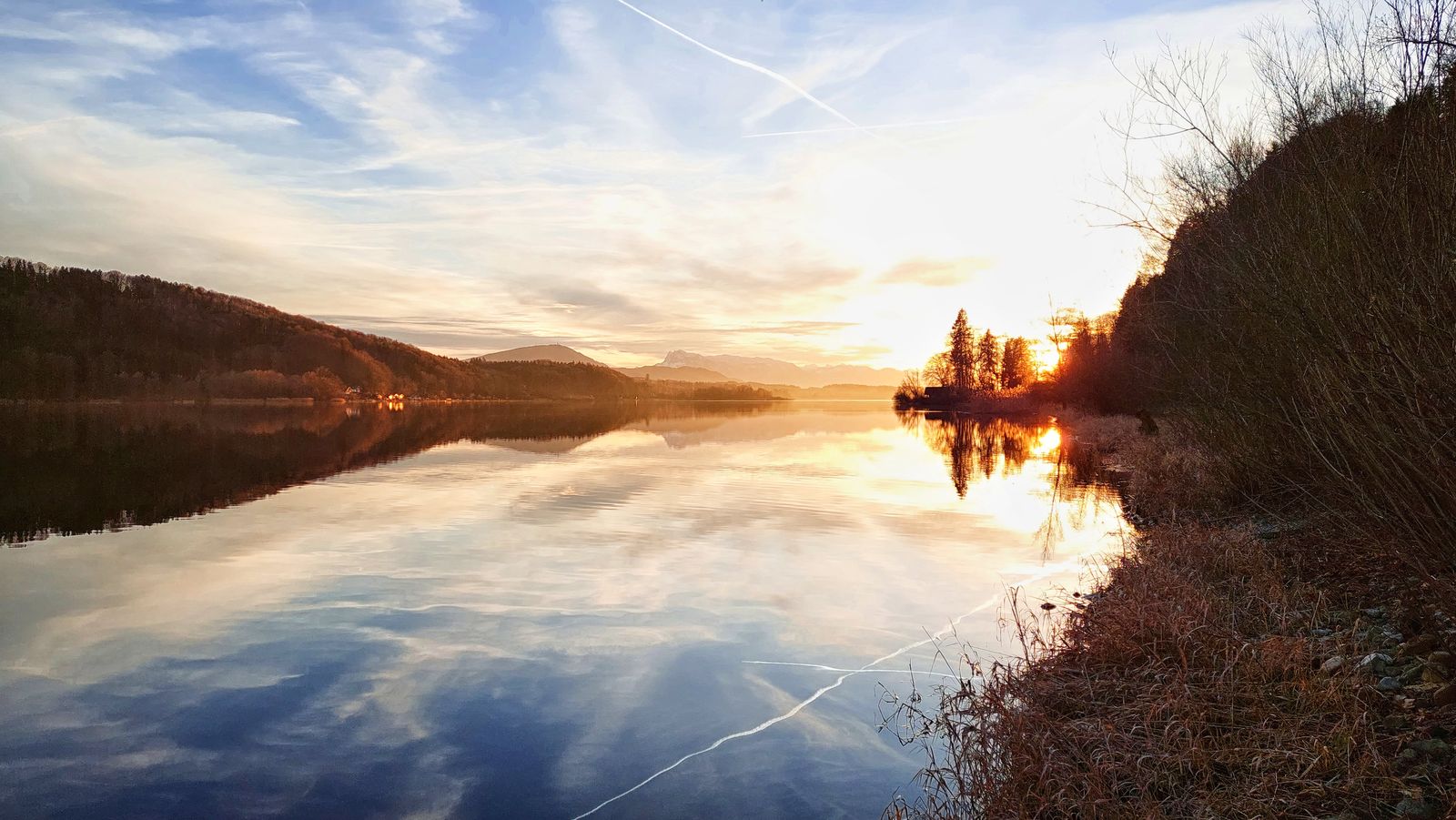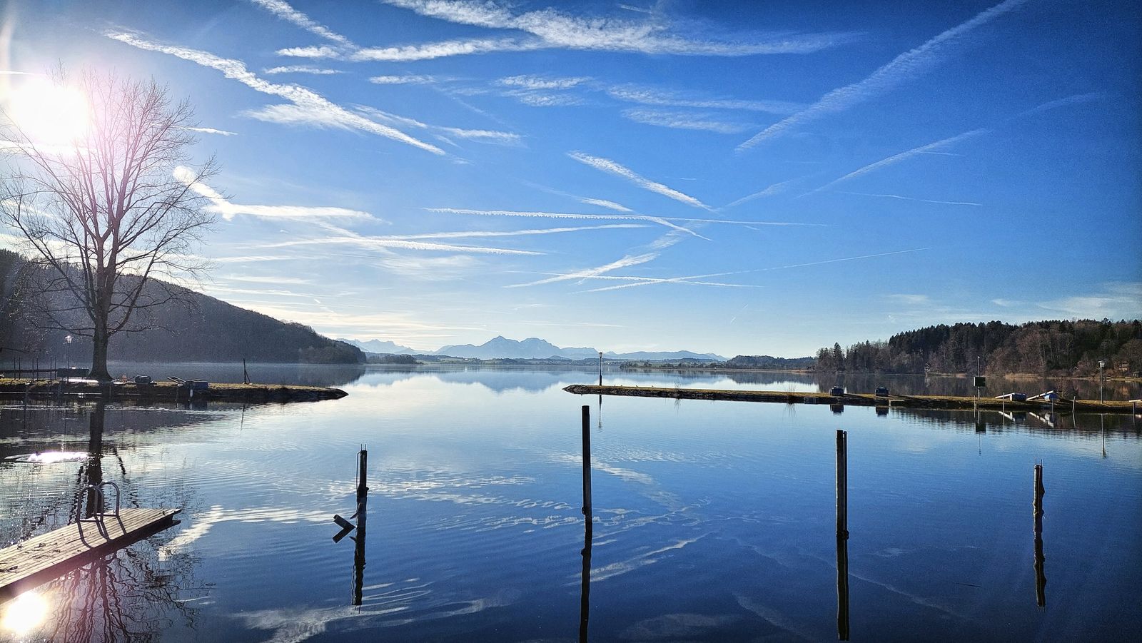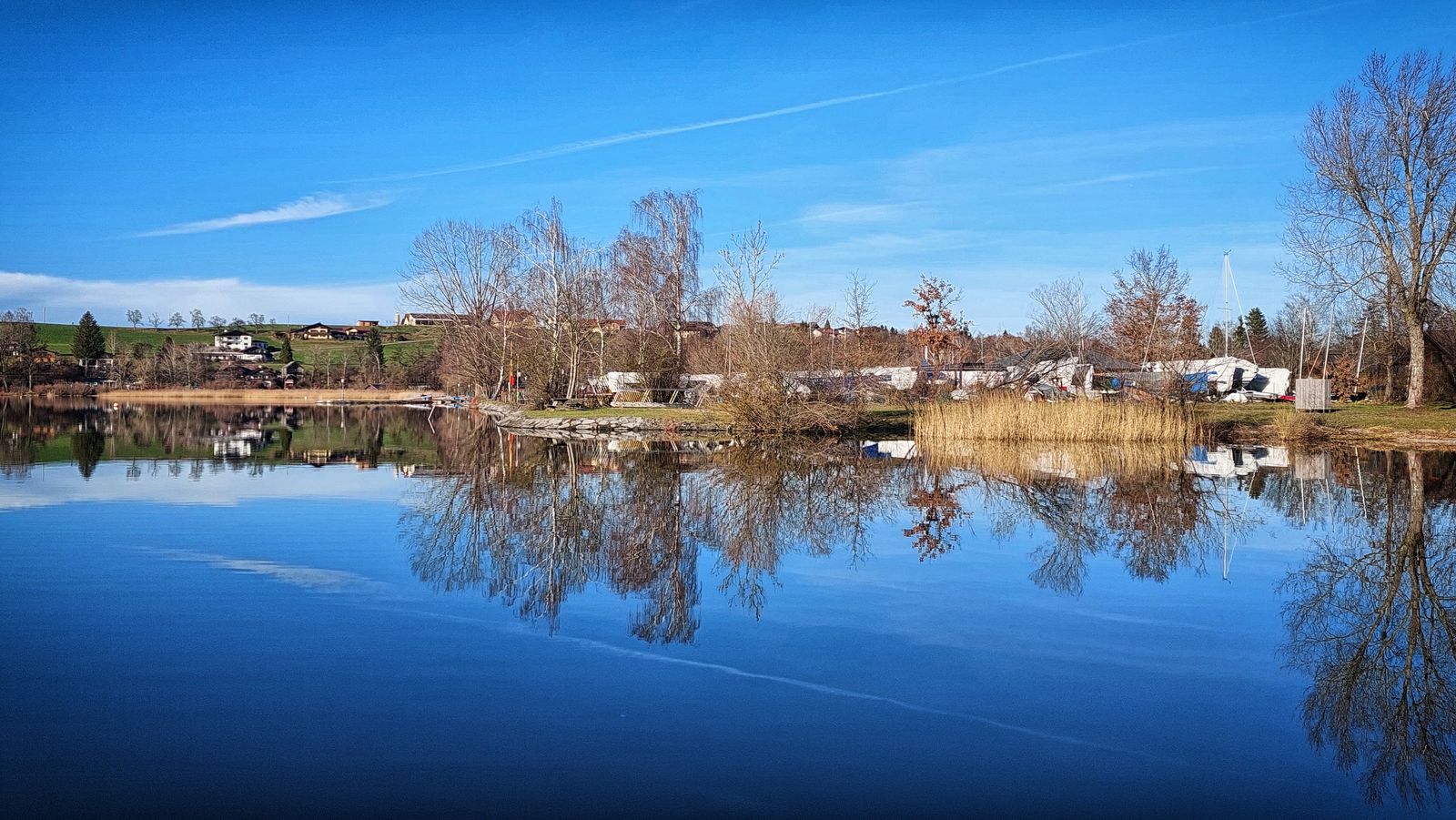 Naturerlebnisse gibt es zwar nicht sehr viele in der Ostbucht, denn das Ufer ist fast durchgehend von Ferienhäusern und kleinen Anwesen gesäumt, doch das Panorama ist ziemlich atemberaubend. Windstill ist es nun nach den stürmischen Tagen vor Weihnachten und der Wallersee liegt wie ein Spiegel vor uns. Darin spiegeln sich der Staufen im Westen auf bayrischer Seite, sowie der fast schon kitschig blaue Himmel samt Kondensstreifen und zarten Zirruswolken. Auch die Häuschen am Ufer werden von der glatten Wasseroberfläche wunderbar reflektiert.
