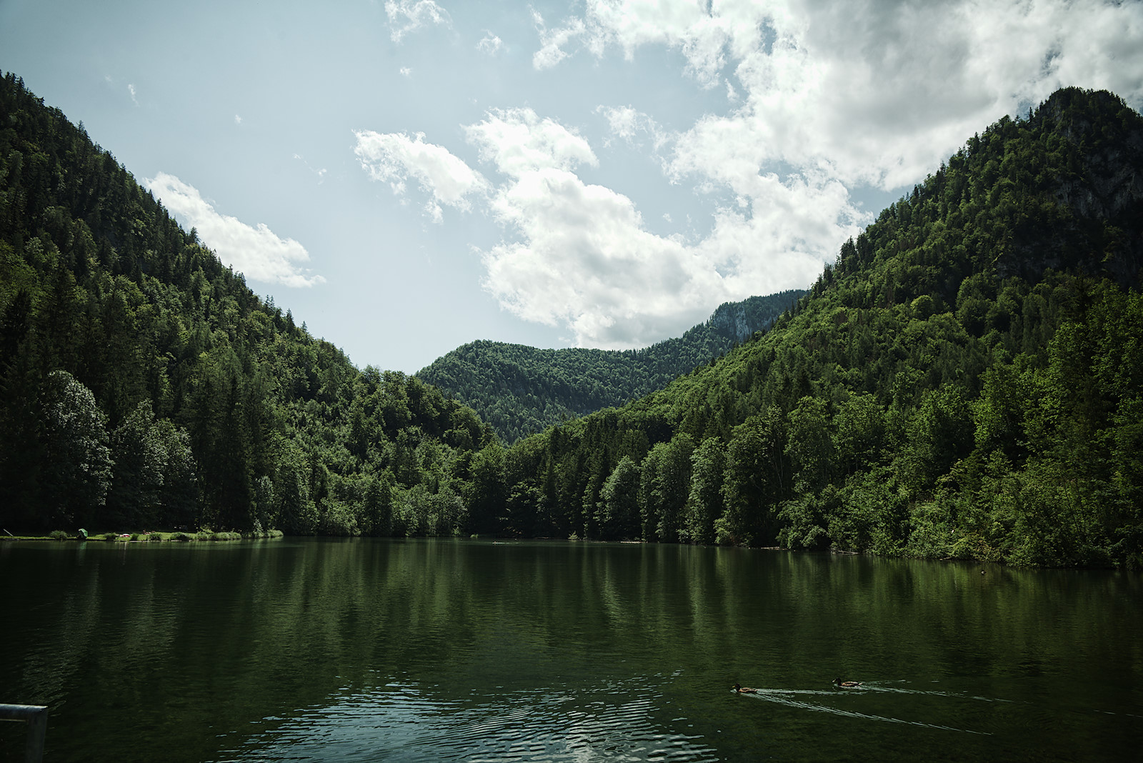 Auf breiten, durchwegs schattigen Spazierwegen geht es mit dem Kinderwagen rund um den Falkenstein bei Inzell im bayrischen Chiemgau. Vorbei an gleich drei malerischen Seen wandern wir dabei ohne Anstrengung durch abwechslungsreiche und idyllische Landschaft.