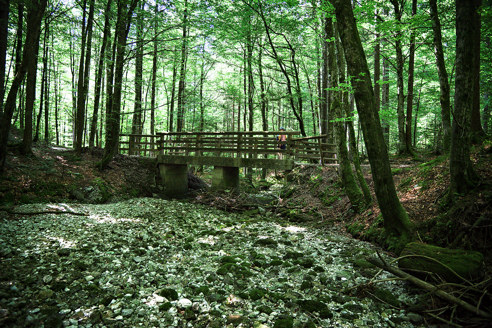 Eine Veränderung gibt es dann doch: Den Weißbachfall lassen wir aus, weil mit dem Kinderwagen nicht erreichbar. Allerdings dürfte auch so gut wie kein Wasser darin sein, da der Hauptzufluss, den wir bald in Richtung „Foudawogn“ – einem Imbiss, nur wenige hundert Meter vom Rundweg entfernt – überqueren, staubtrocken ist. Trotzdem interessant, so ein ausgetrocknetes Bachbett.