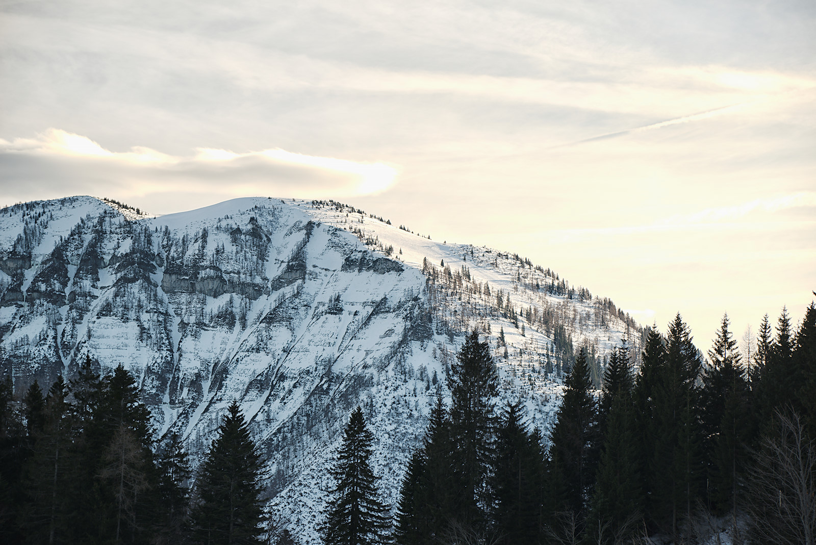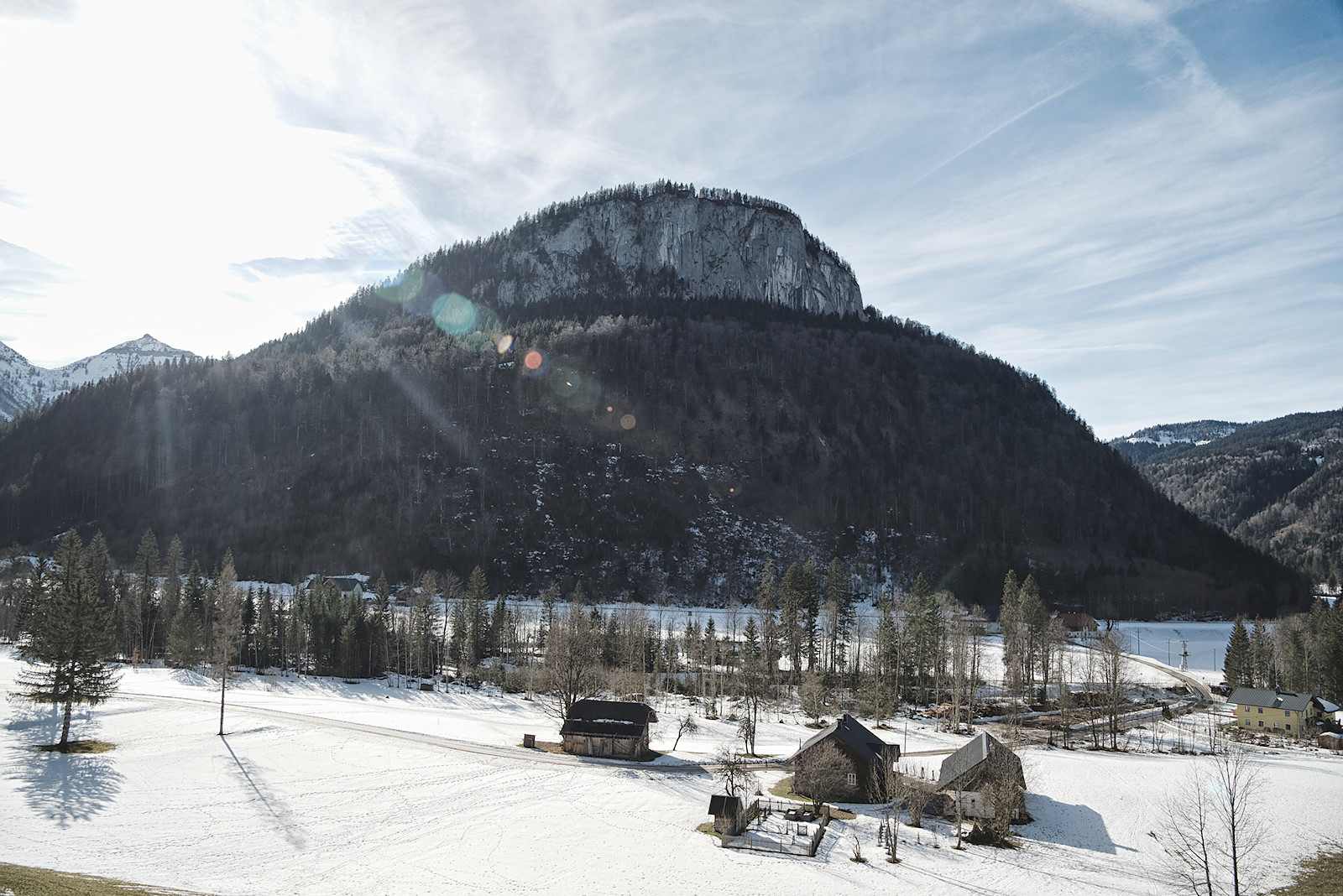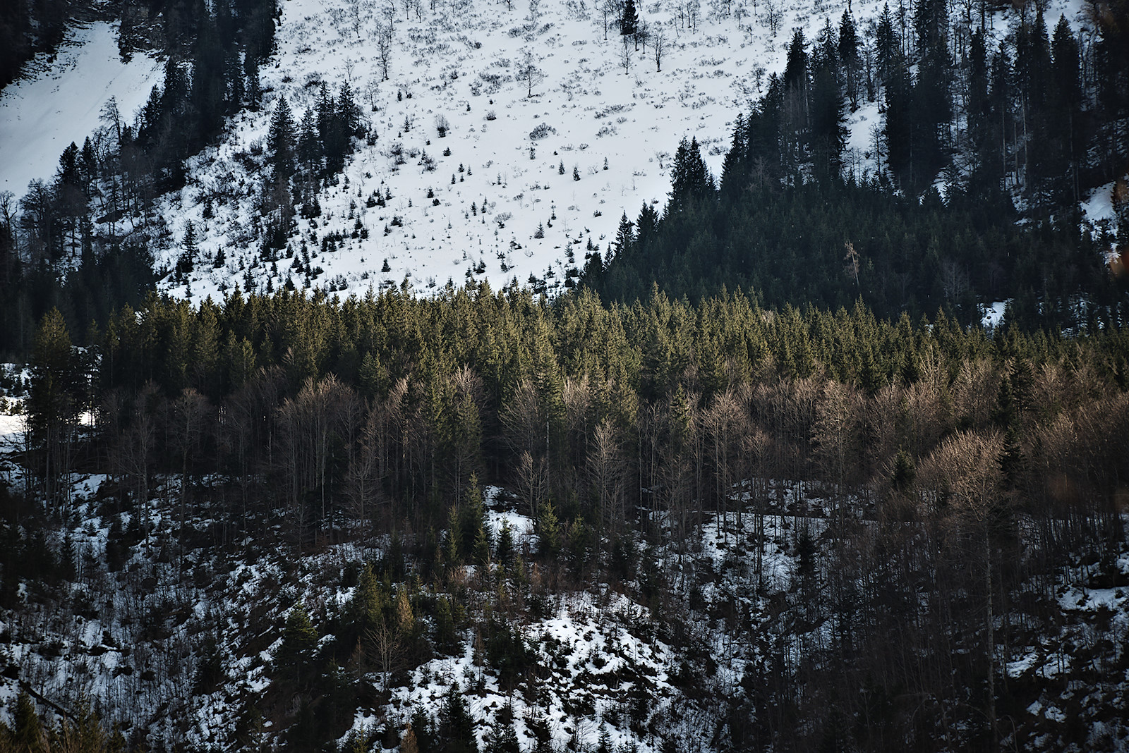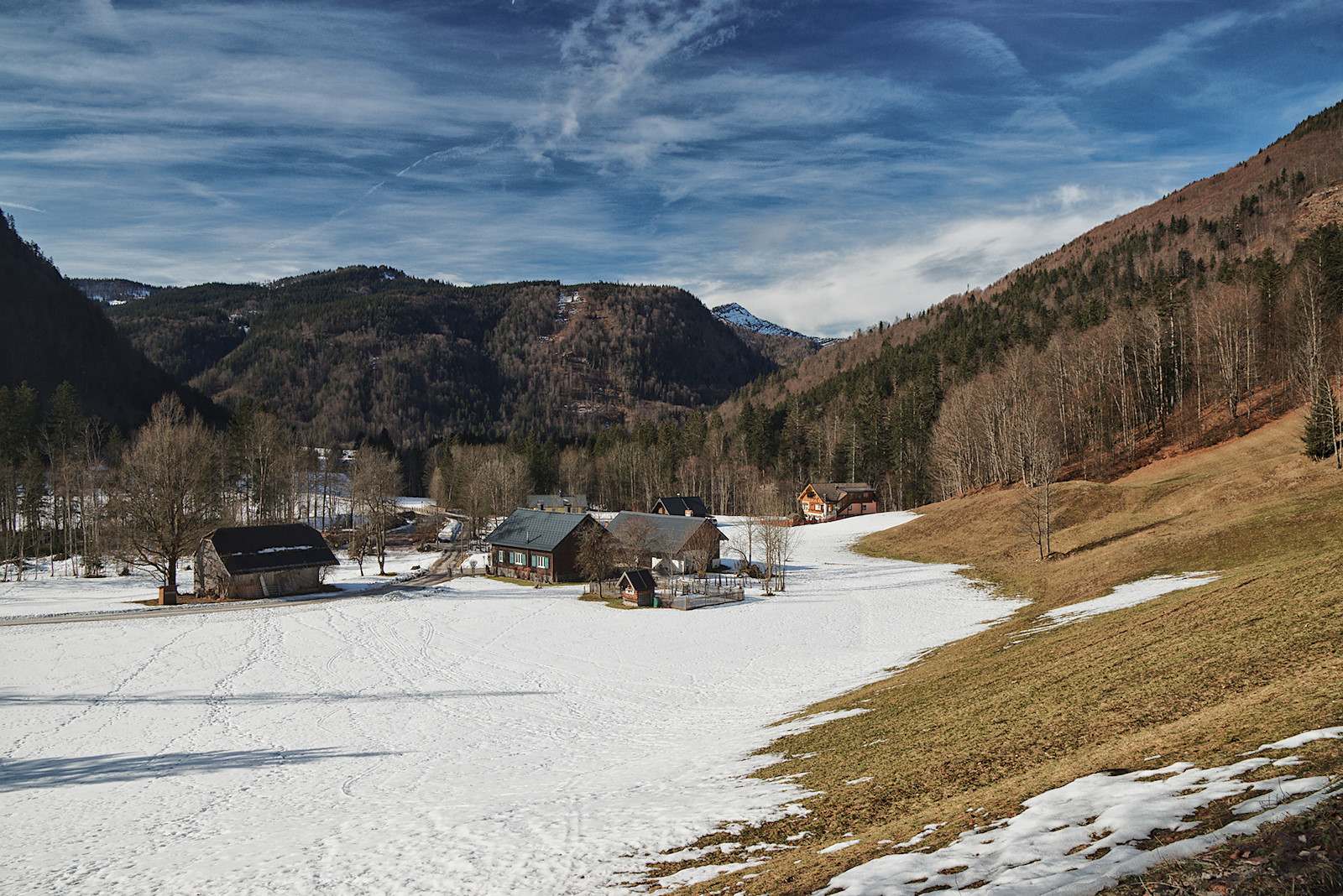 Heute ist es allerdings tatsächlich ungewöhnlich warm. Kräftiger Föhn lässt die Temperaturen klettern. Selbst im ansonsten eher kühlen Hinterseetal zeigt das Thermometer bei meiner Ankunft 12 Grad Plus. Noch hält sich am Talboden eine geschlossene Schneedecke, als ich die Siedlung Unterzagl kurz nach dem Ort Hintersee erreiche. Ganz anders die Südhänge des Tales: Sie sind schon seit Längerem komplett schneefrei bis hinauf zu den Gipfeln.