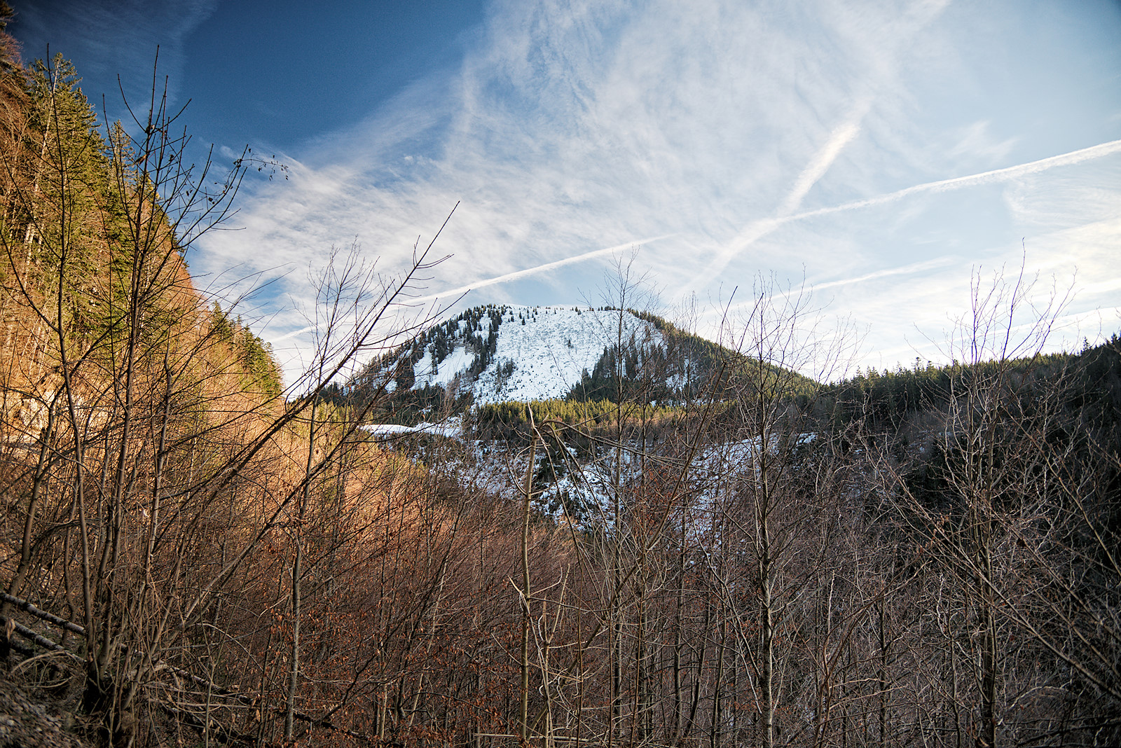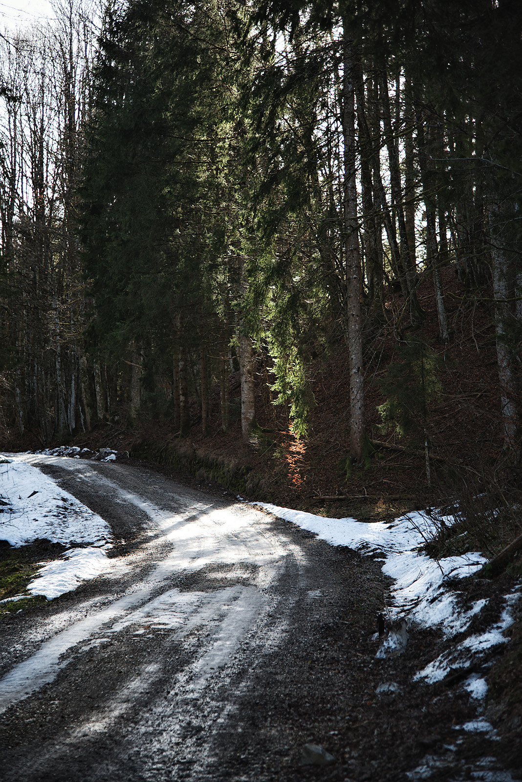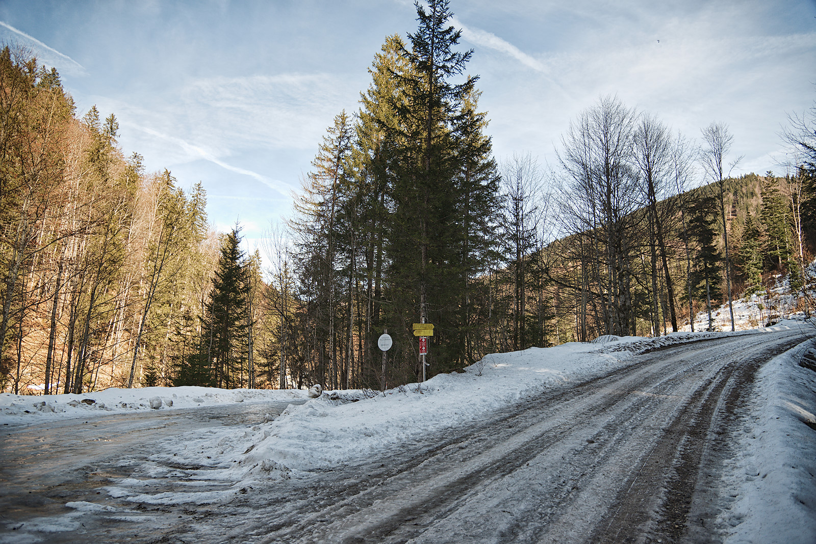 Erst ab etwa 1.100 Meter Meereshöhe betrete ich endgültig das Reich von Schnee und Eis. Interessant ist aber, dass die Straße vom Schnee geräumt ist, vermutlich um den Abtransport des Holzes, welches ja gerade im Winter geschlagen wird, zu erleichtern. Die Fahrbahn ist allerdings sehr stark vereist und praktisch nicht begehbar. Doch am Straßenrand komme ich zumeist ganz gut voran, auch wenn Spikes oder Grödeln sicherlich hilfreich wären. Der Grund für den plötzlichen Übergang in Schnee ist nicht etwa, dass es hier oben wesentlich kälter wäre, sondern weil ich nun langsam aber sicher in den Schatten des Königsbergs gelange.