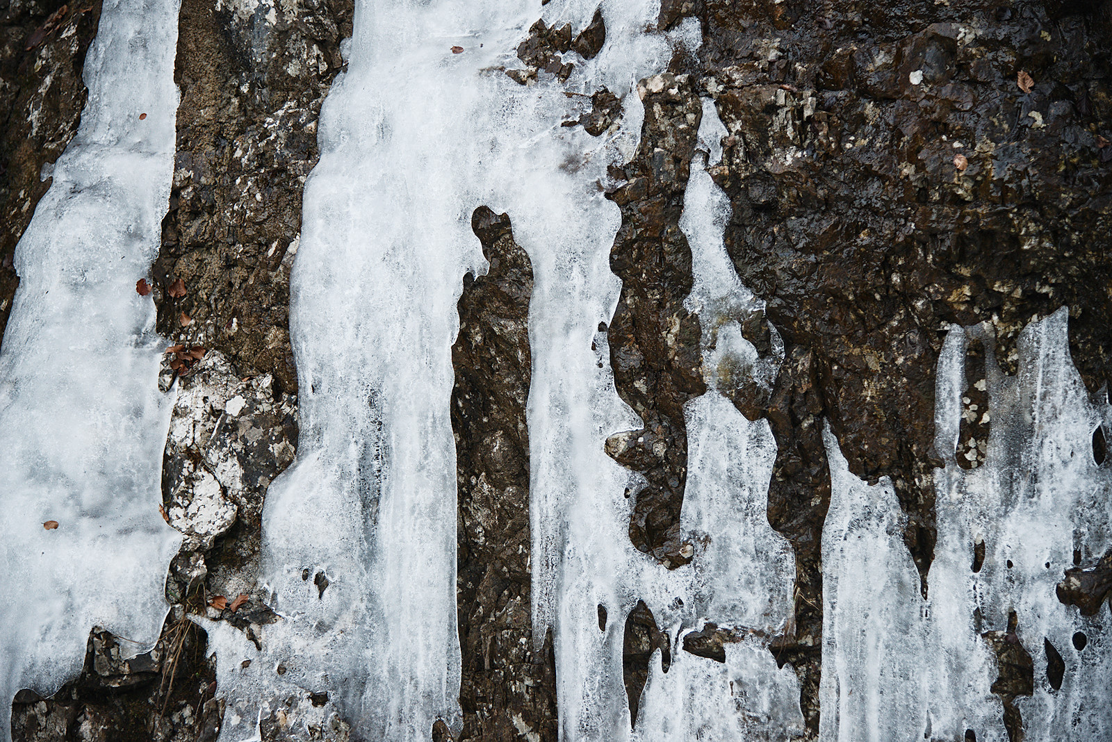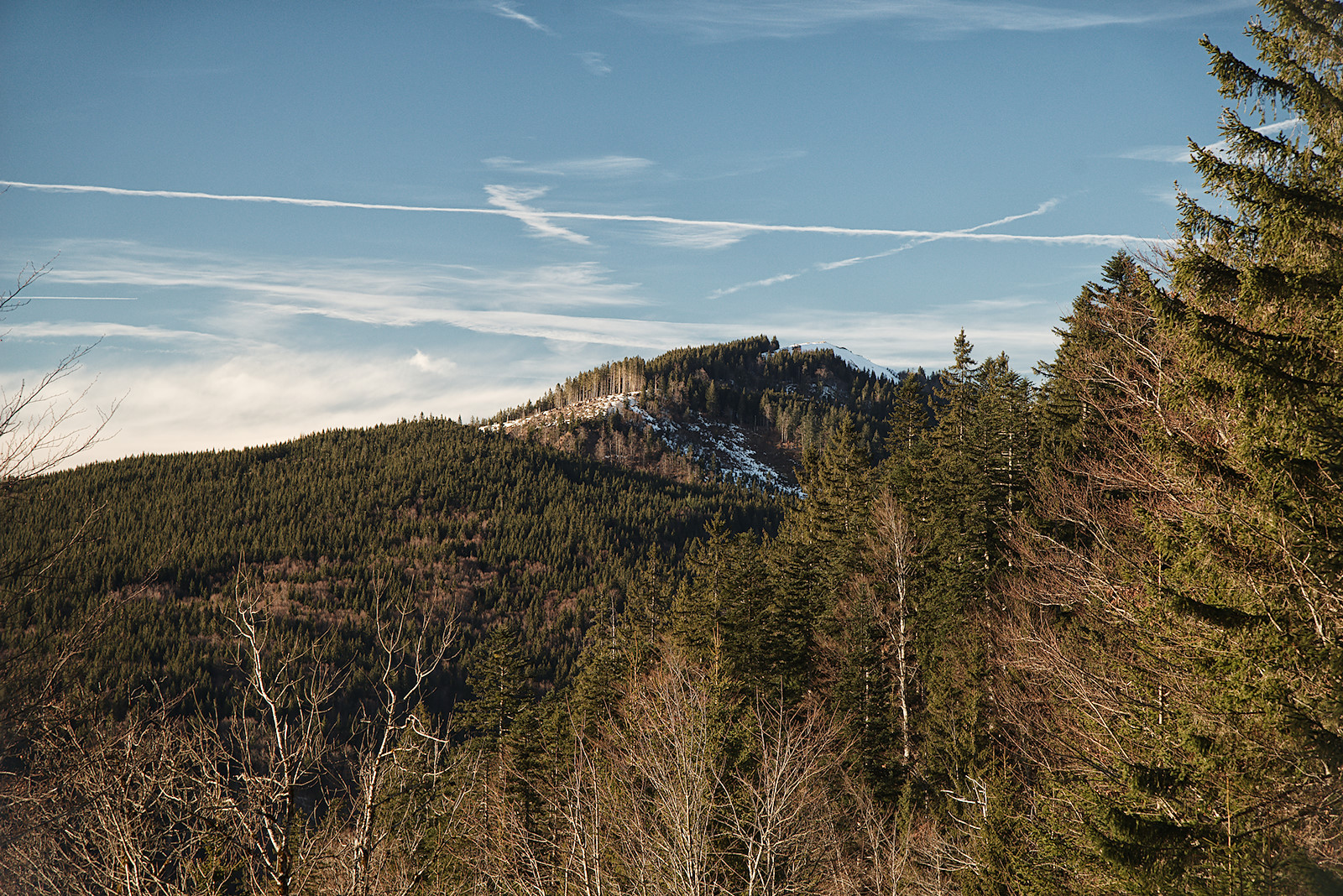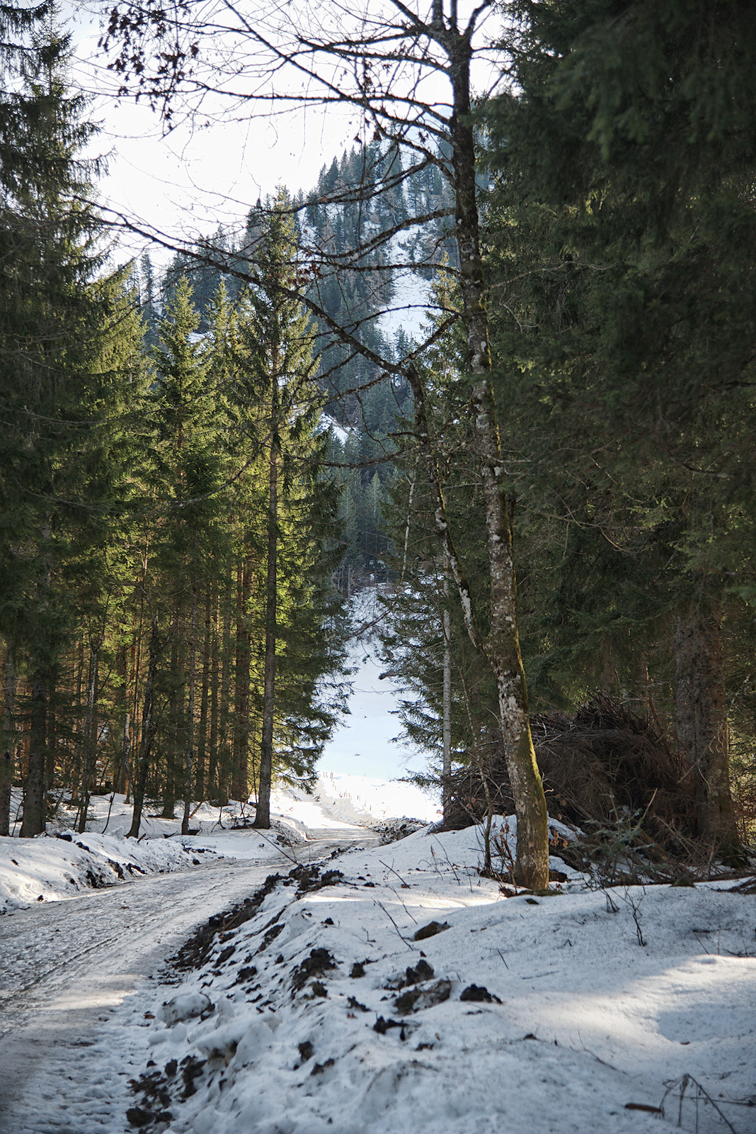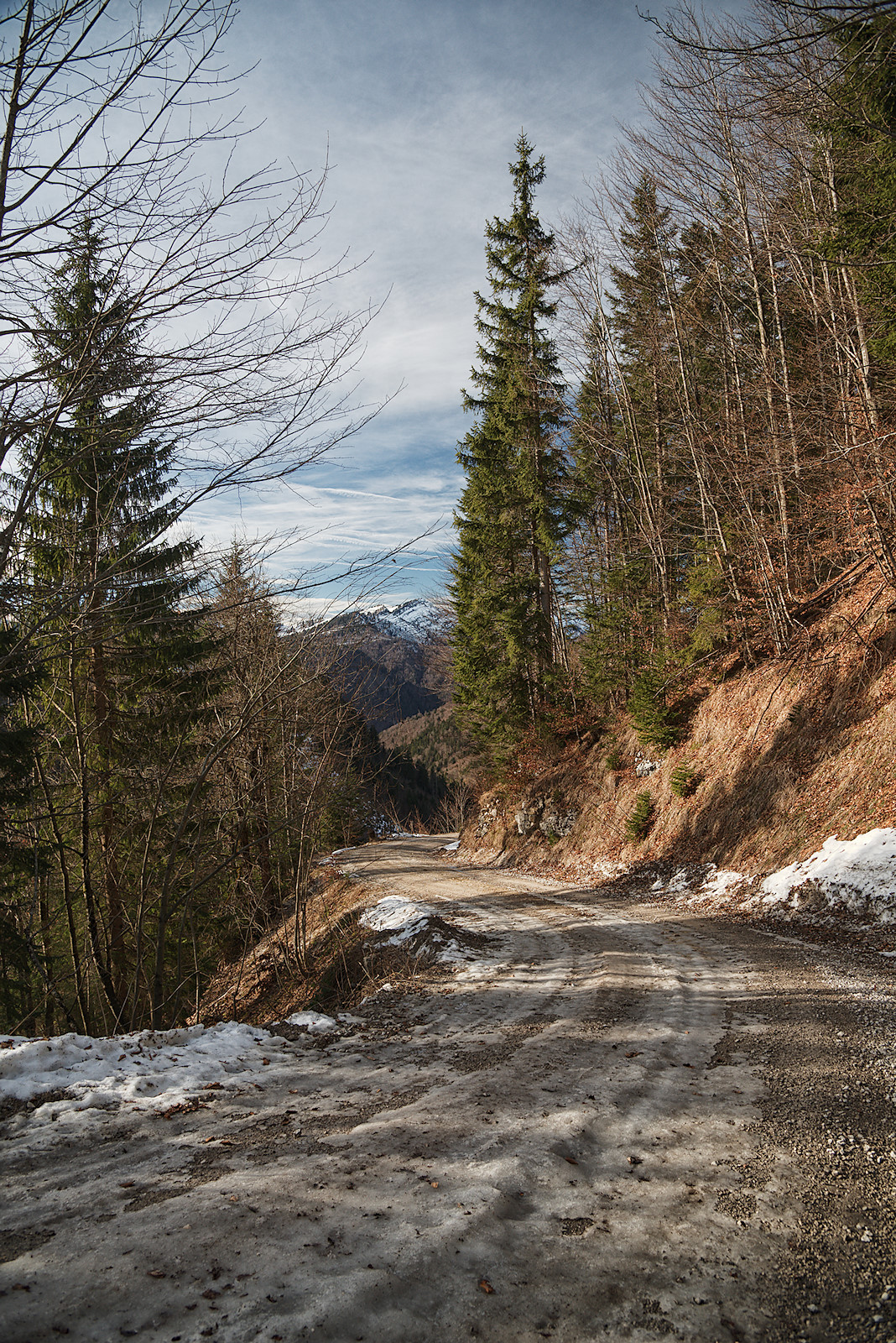 Erst ab etwa 1.100 Meter Meereshöhe betrete ich endgültig das Reich von Schnee und Eis. Interessant ist aber, dass die Straße vom Schnee geräumt ist, vermutlich um den Abtransport des Holzes, welches ja gerade im Winter geschlagen wird, zu erleichtern. Die Fahrbahn ist allerdings sehr stark vereist und praktisch nicht begehbar. Doch am Straßenrand komme ich zumeist ganz gut voran, auch wenn Spikes oder Grödeln sicherlich hilfreich wären. Der Grund für den plötzlichen Übergang in Schnee ist nicht etwa, dass es hier oben wesentlich kälter wäre, sondern weil ich nun langsam aber sicher in den Schatten des Königsbergs gelange.
