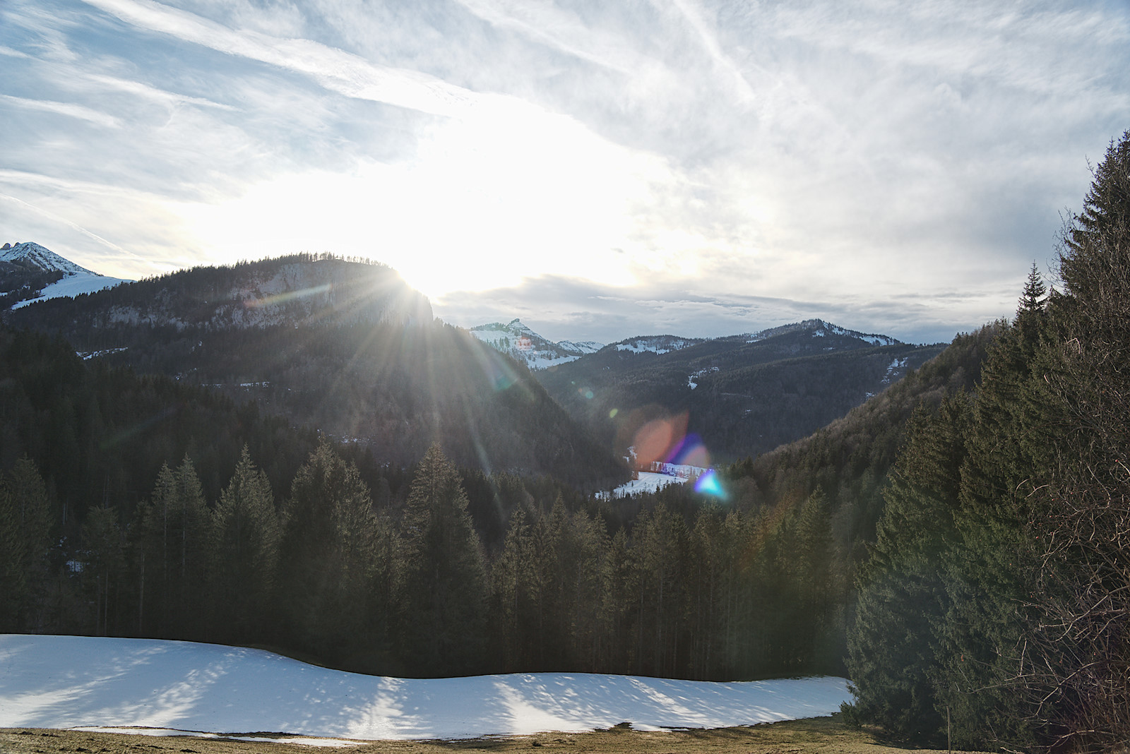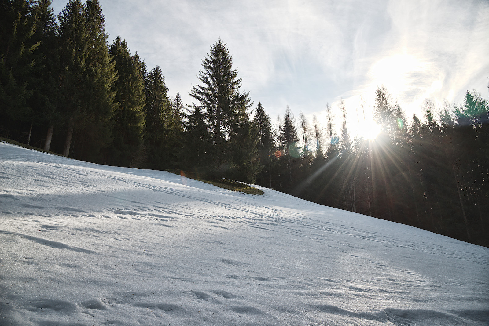 Dort angekommen, stelle ich fest, dass die Schneedecke in den wenigen Stunden, in denen ich oben am Berg war, sehr stark gelitten hat. Das Eis auf der Fahrbahn ist aufgeweicht und die Langlaufloipen, die sich durch das Tal schlängeln, sind stellenweise schon ganz braun und kaum noch zu benutzen. Mein Auto verrät mir, dass es immer noch zwölf Grad hat.