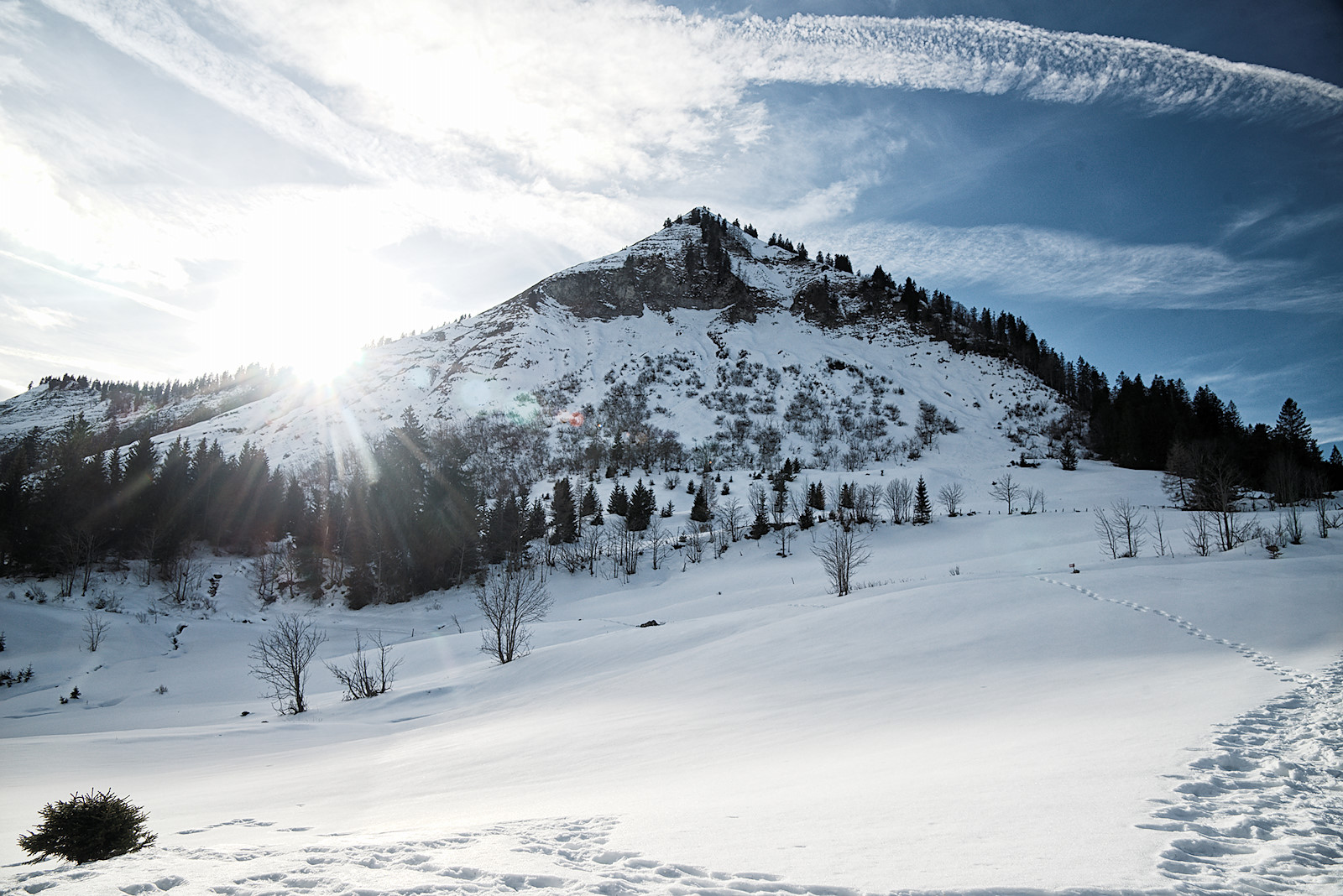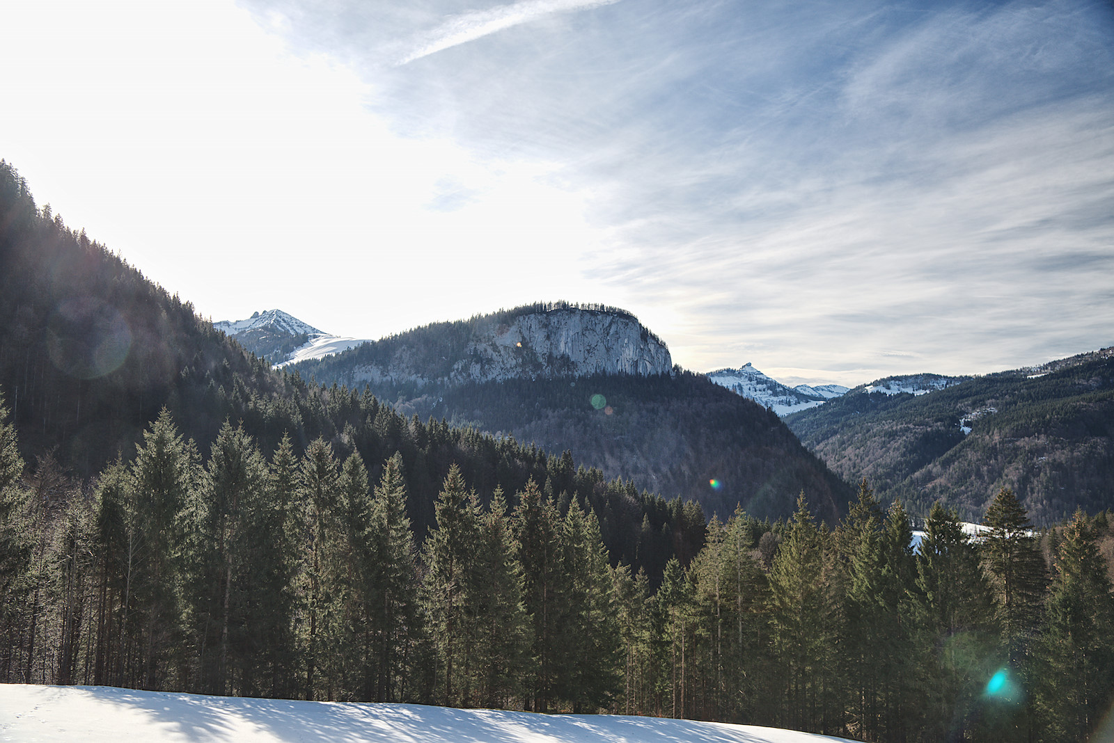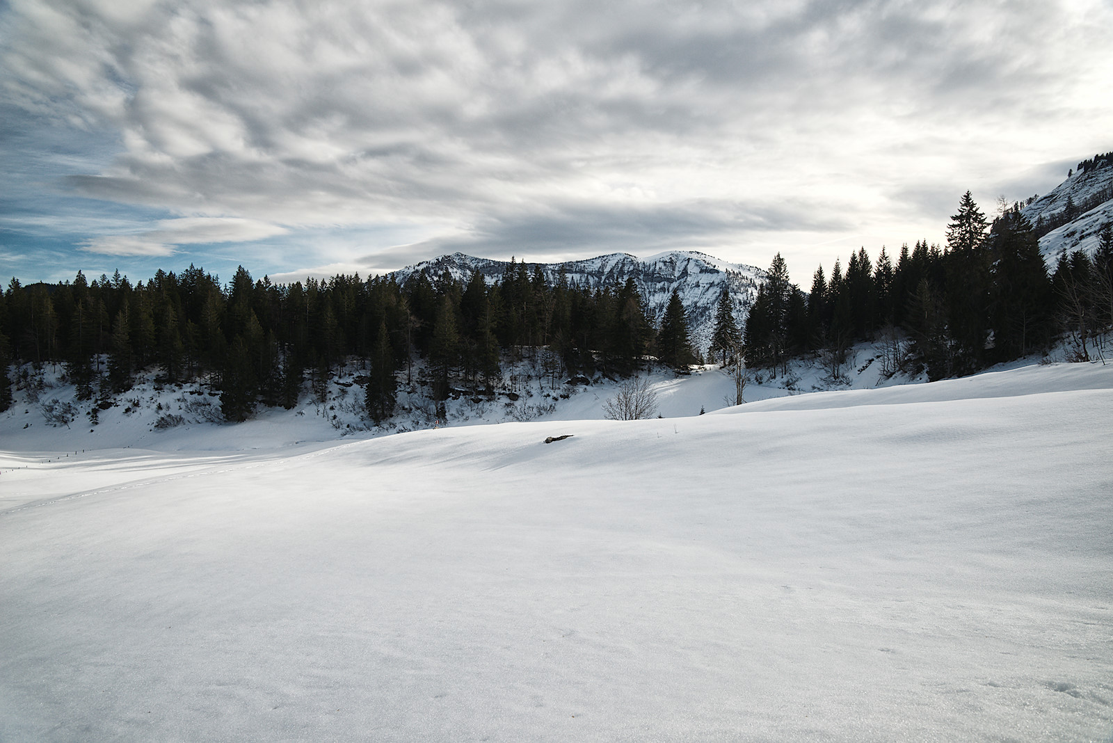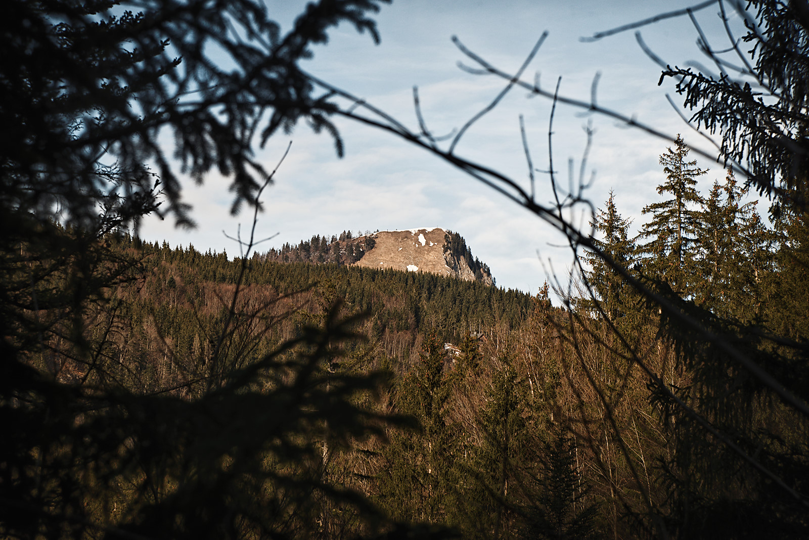 Wanderte ich bis jetzt ausschließlich durch Wald, ist nun bald eine größere Lichtung erreicht. Hier öffnet sich der erste Blick auf Gruberhorn (1.732 m) und Regenspitz (1.675 m) im Süden, sowie den markanten Schmittenstein (1.695 m). Und natürlich darf auch der Feichtenstein (1.249 m) nicht unerwähnt bleiben, dessen beeindruckende Felswand sich gleich auf der gegenüberliegenden Seite des Hinterseetals erhebt, der mir aber seine dunkle Schattenseite um diese Tageszeit zuwendet.