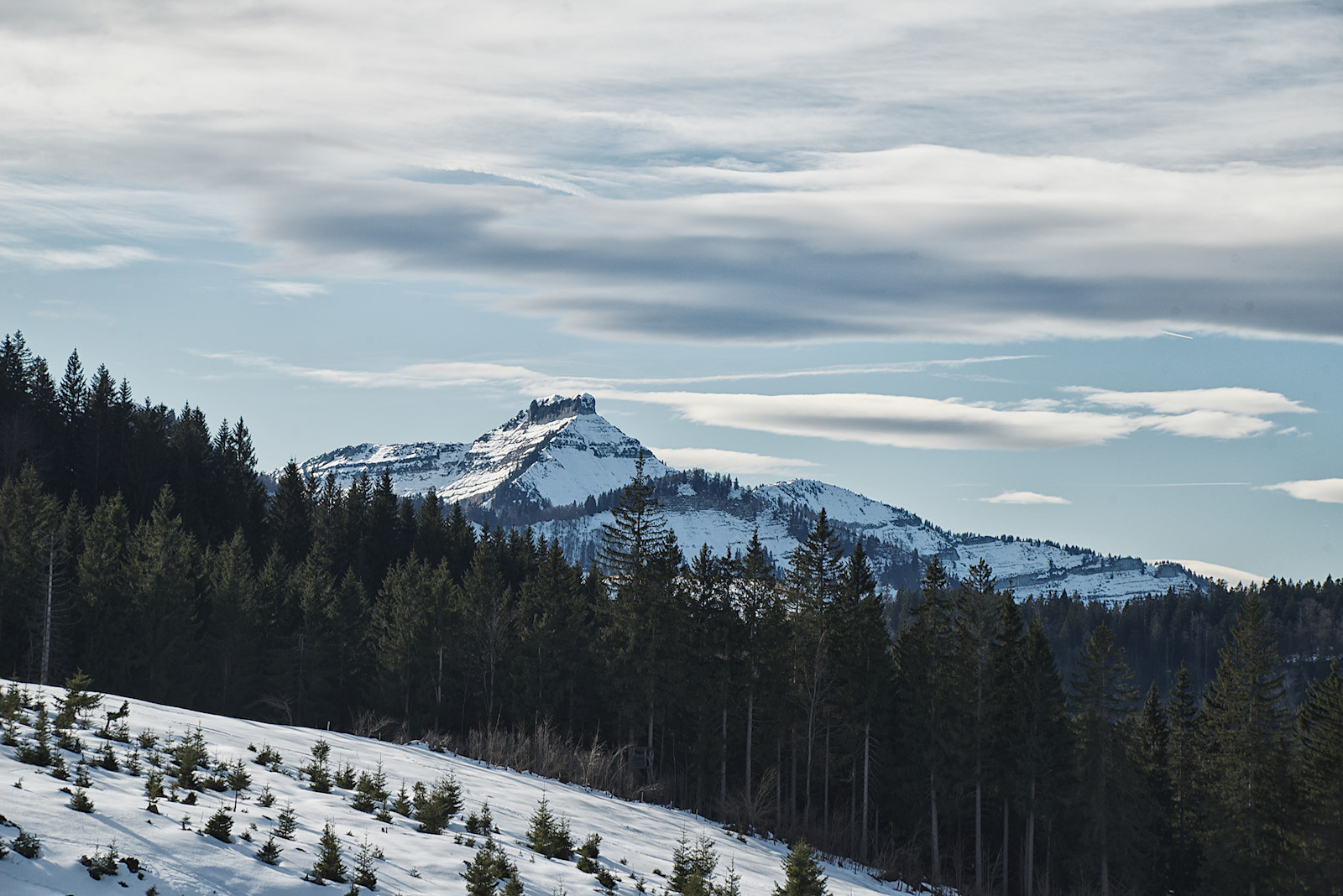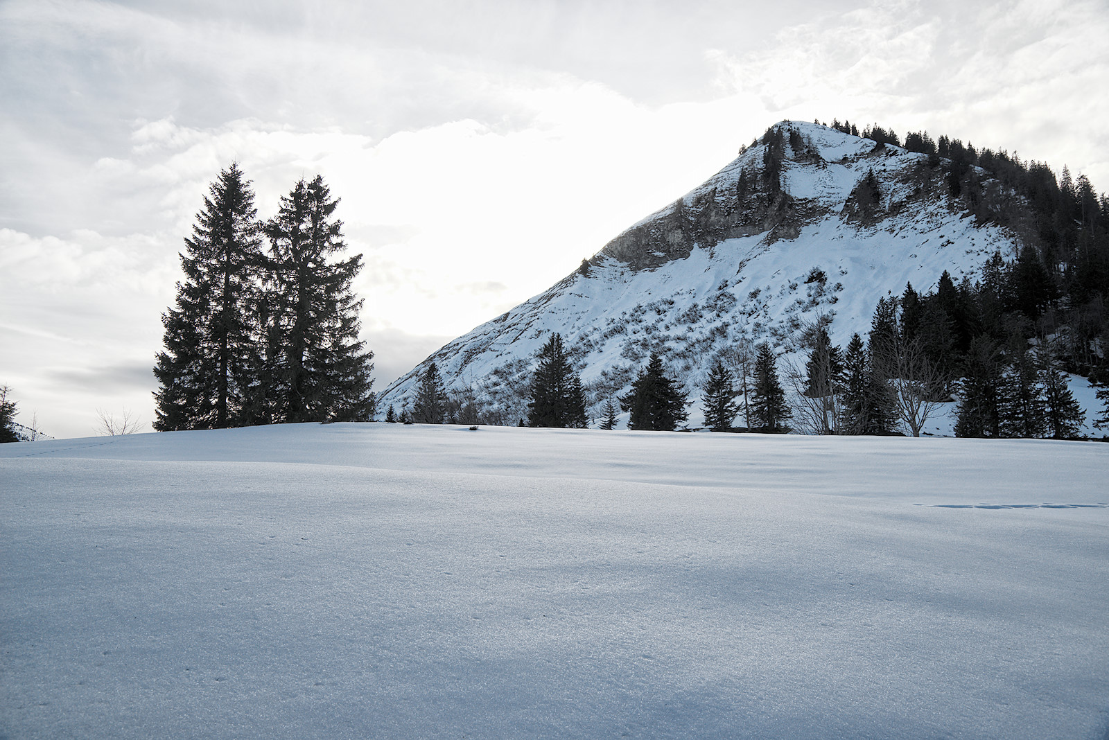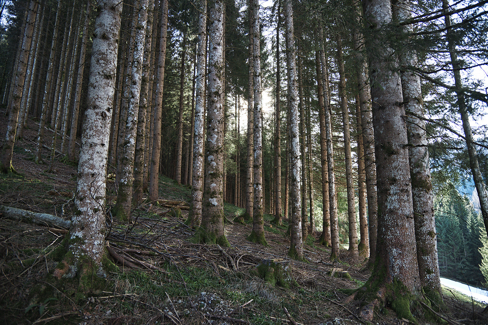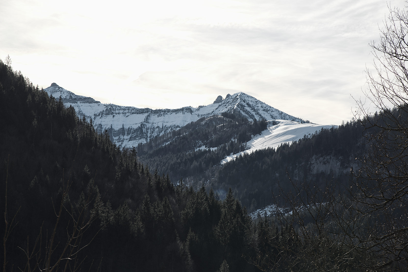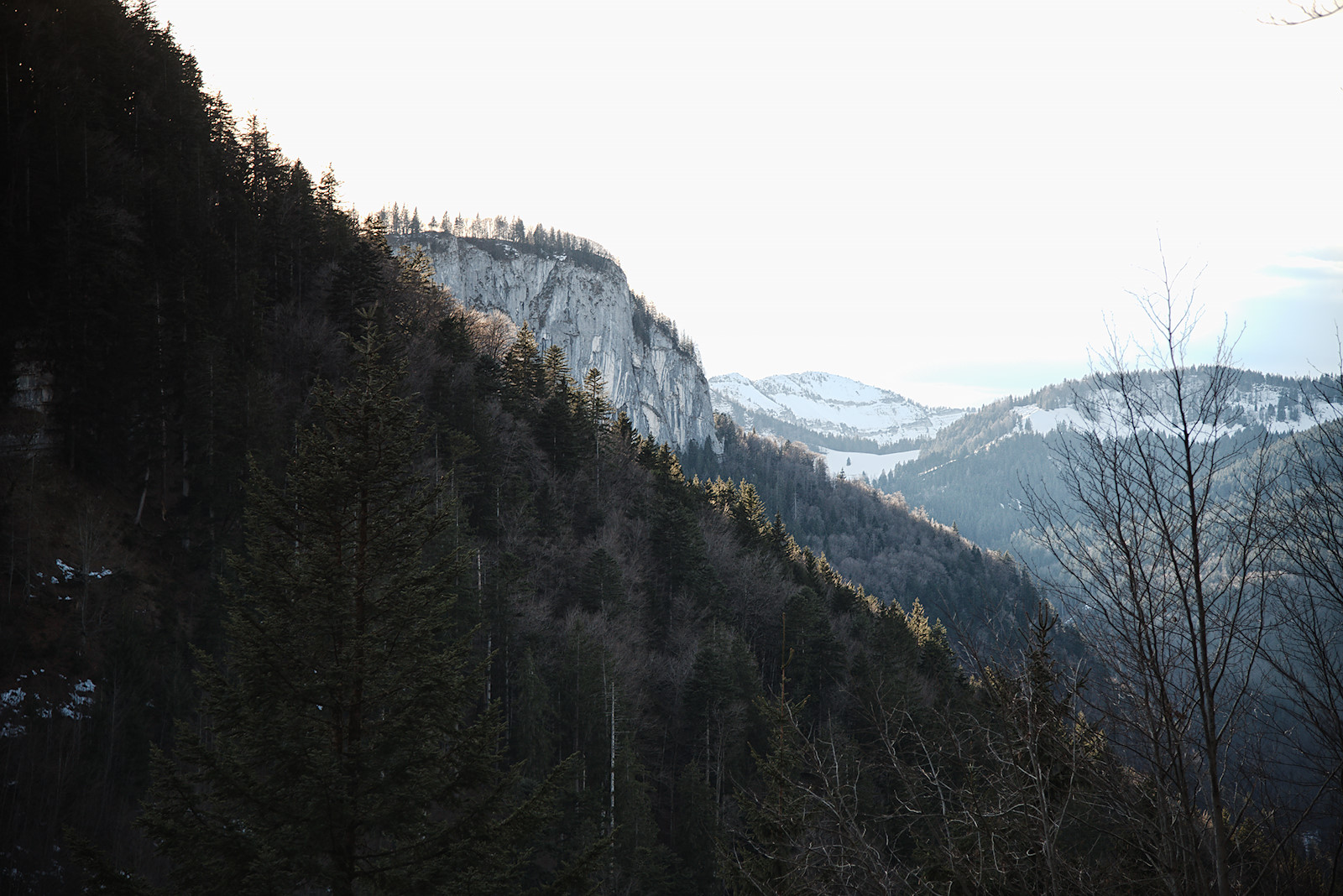 Wanderte ich bis jetzt ausschließlich durch Wald, ist nun bald eine größere Lichtung erreicht. Hier öffnet sich der erste Blick auf Gruberhorn (1.732 m) und Regenspitz (1.675 m) im Süden, sowie den markanten Schmittenstein (1.695 m). Und natürlich darf auch der Feichtenstein (1.249 m) nicht unerwähnt bleiben, dessen beeindruckende Felswand sich gleich auf der gegenüberliegenden Seite des Hinterseetals erhebt, der mir aber seine dunkle Schattenseite um diese Tageszeit zuwendet.