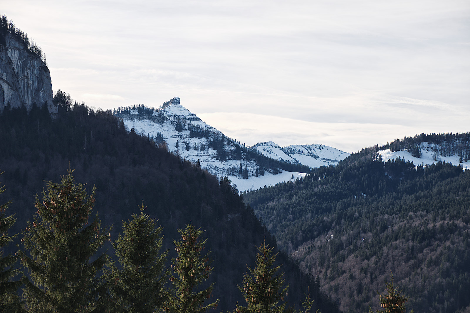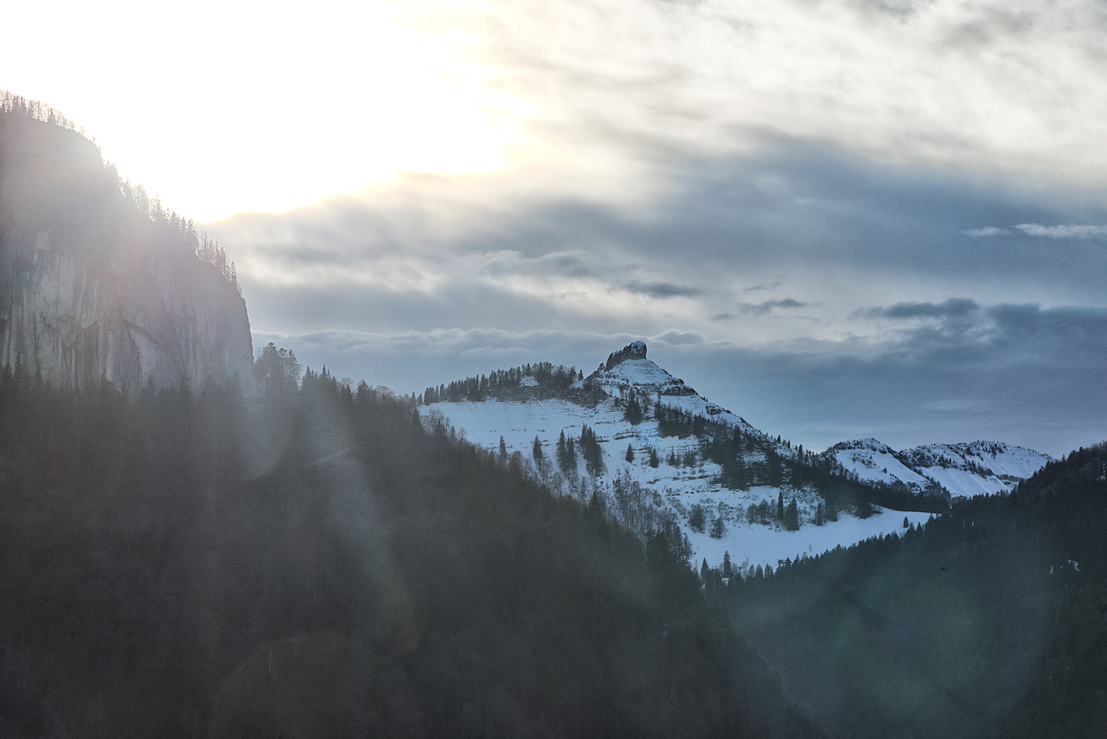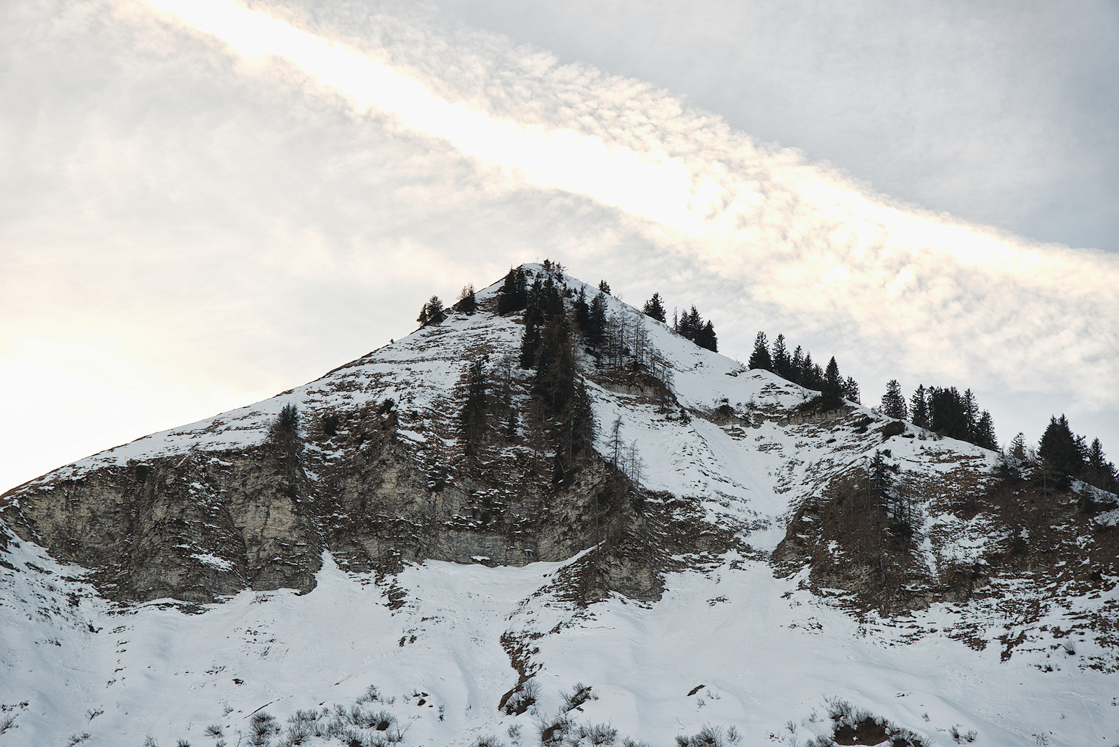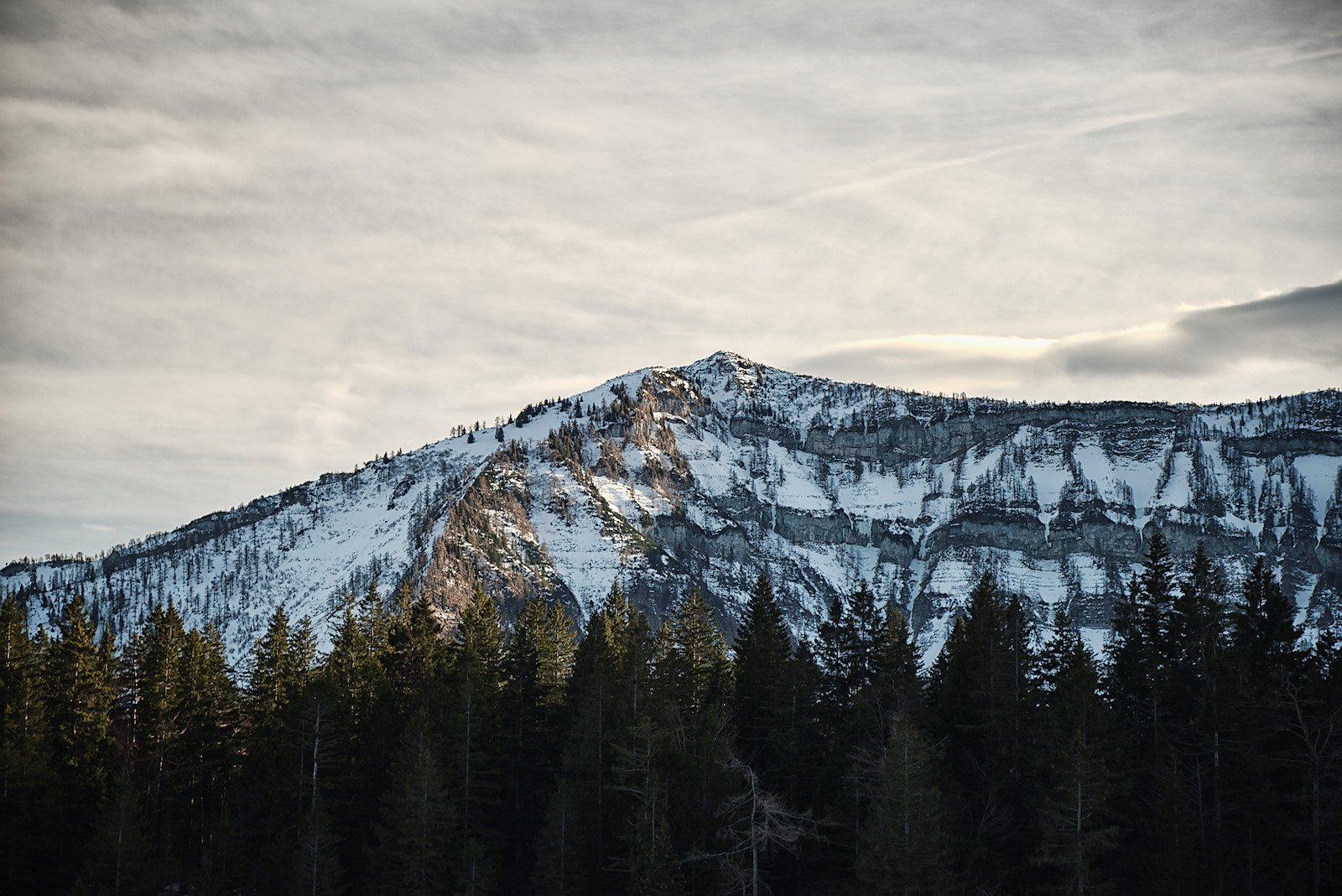 Wanderte ich bis jetzt ausschließlich durch Wald, ist nun bald eine größere Lichtung erreicht. Hier öffnet sich der erste Blick auf Gruberhorn (1.732 m) und Regenspitz (1.675 m) im Süden, sowie den markanten Schmittenstein (1.695 m). Und natürlich darf auch der Feichtenstein (1.249 m) nicht unerwähnt bleiben, dessen beeindruckende Felswand sich gleich auf der gegenüberliegenden Seite des Hinterseetals erhebt, der mir aber seine dunkle Schattenseite um diese Tageszeit zuwendet.