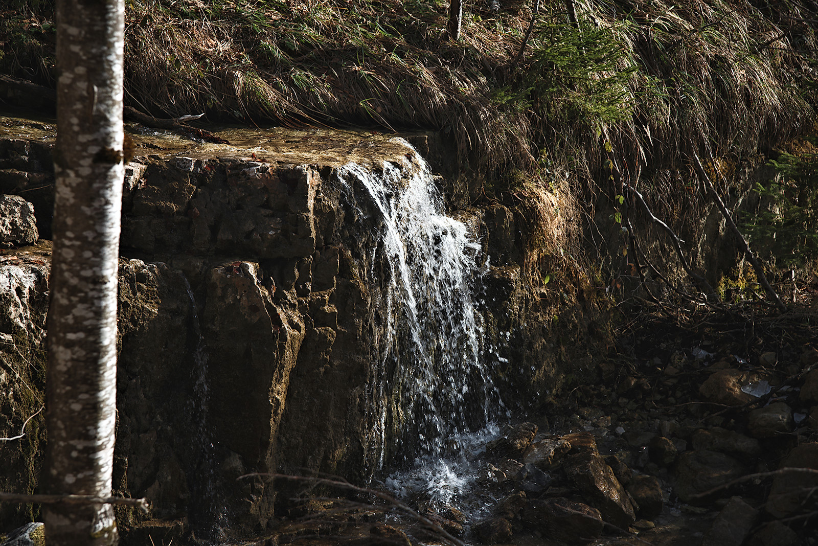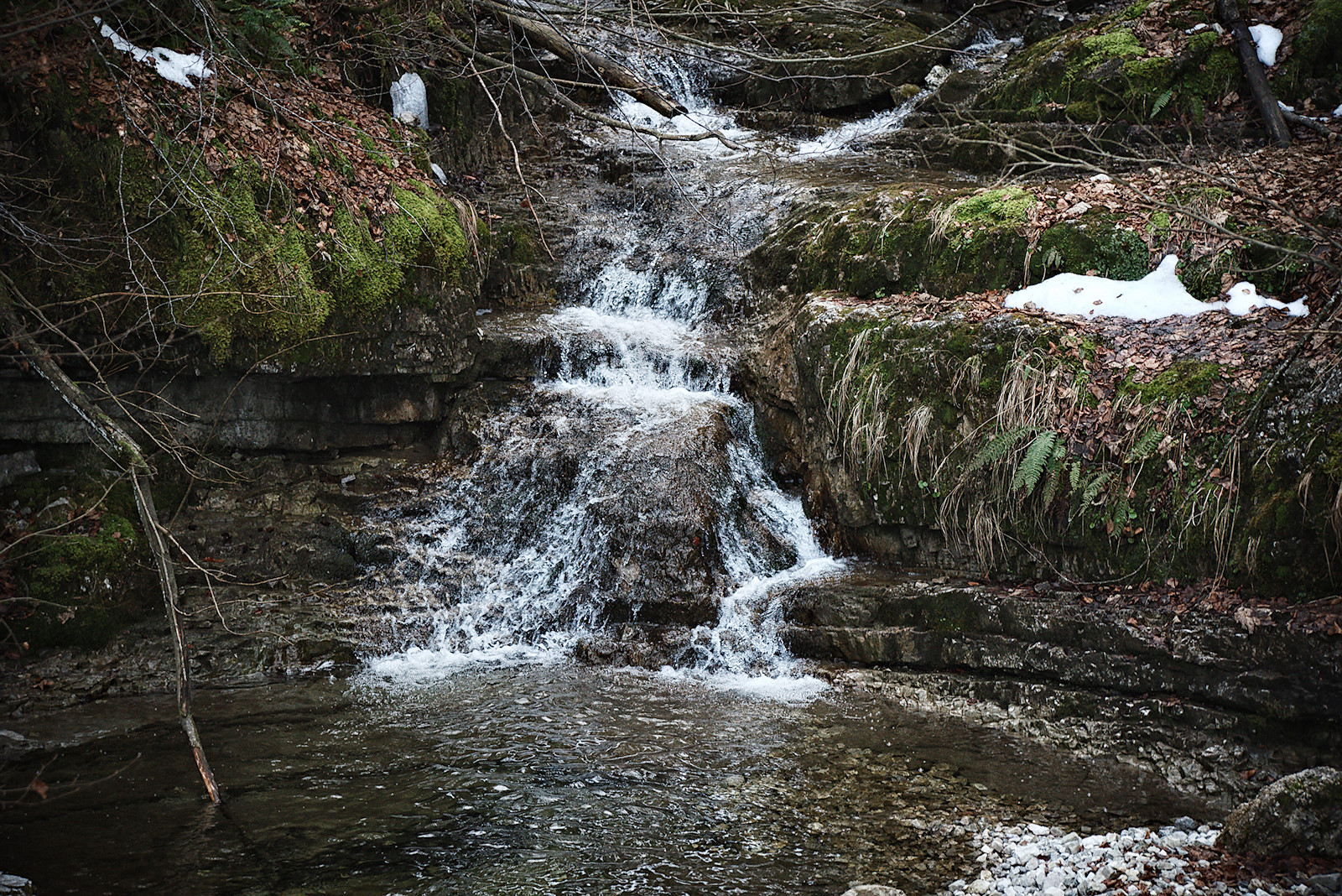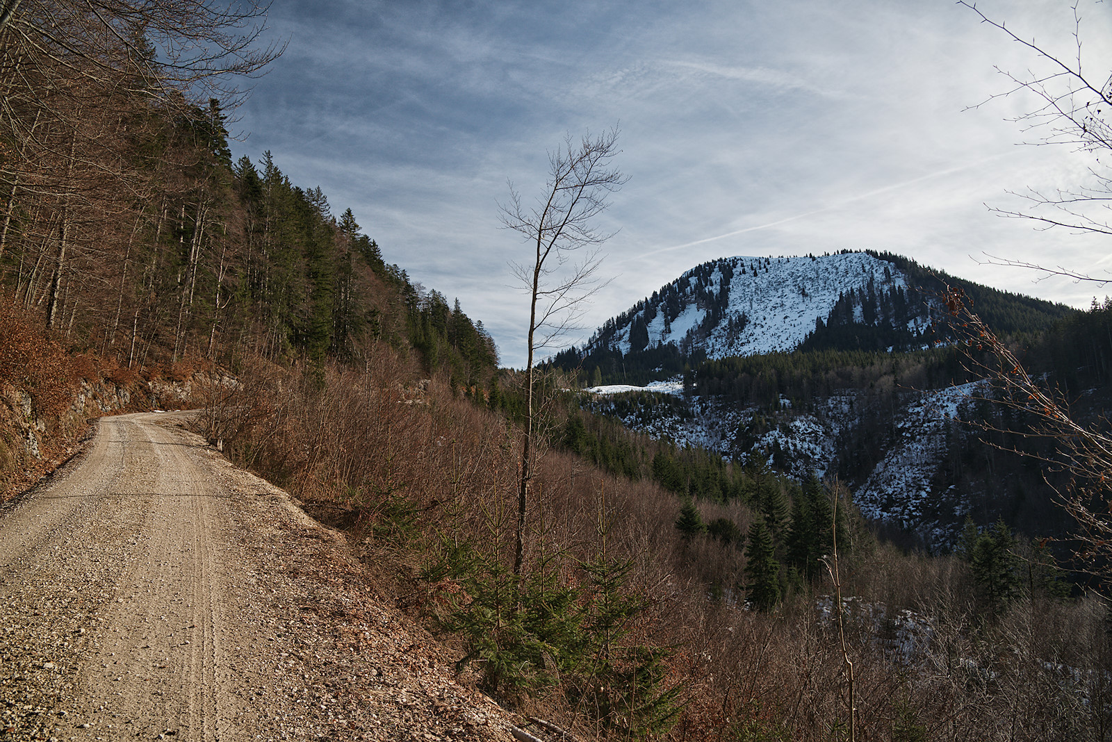Die Straße zieht sogleich den Hang hinauf und wird eisfrei. Abgesehen von ein paar kurzen Abschnitten soll sie dies auch für die nächsten etwa 350 Höhenmeter bleiben. Nach der ersten Steigung verstaue ich meine Jacke gleich mal im Rucksack. Dort sollte sie bis zur Königsalm auch bleiben. Die Forststraße verläuft zunächst oberhalb des Schafbaches, der sich durch seine tiefe Schlucht unter mir windet, wendet sich dann aber dessen Seitenast, dem Marchgraben, zu. Auf einer Brücke wird dieser schließlich überquert.