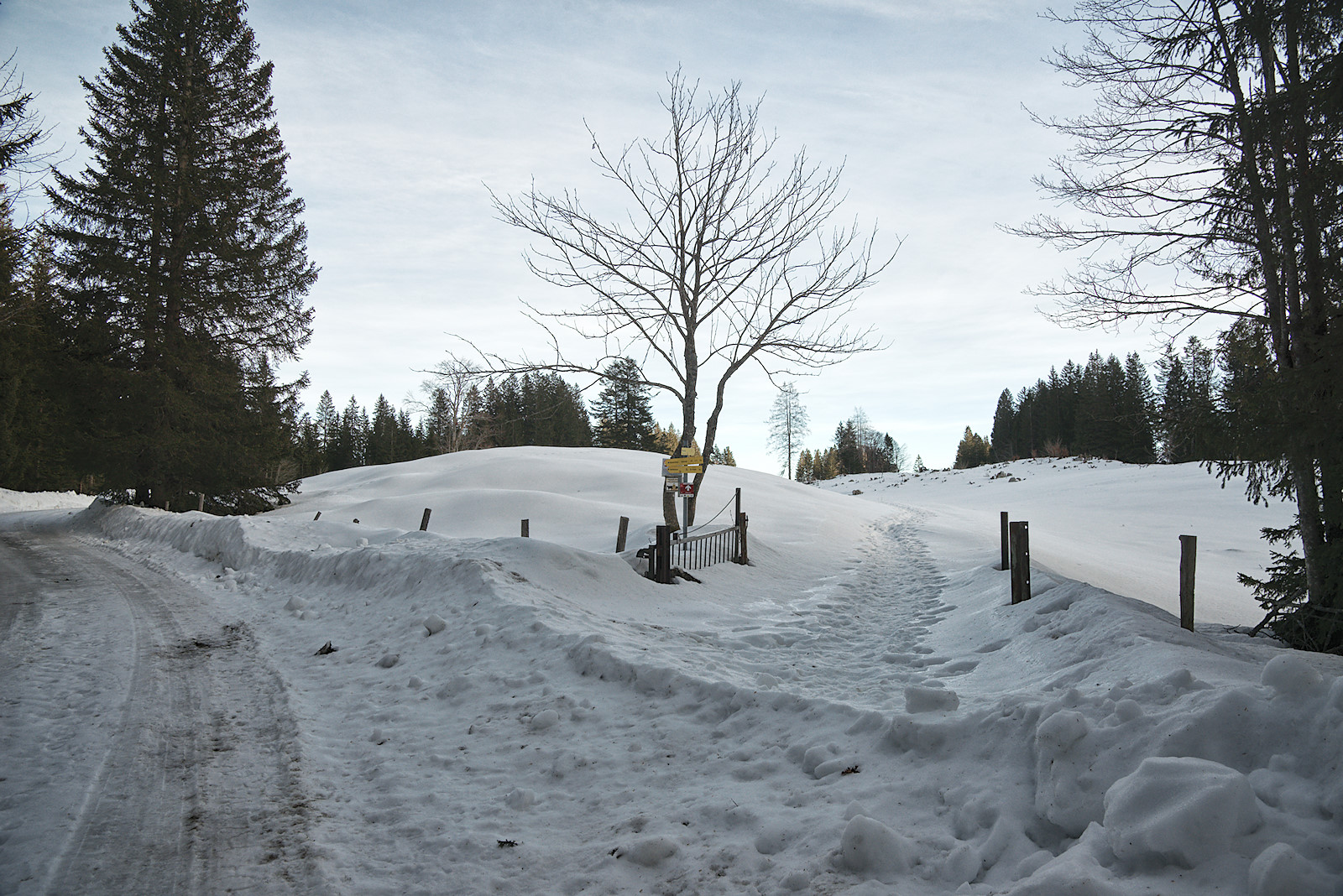 Doch der Rückweg über die schneebedeckte Almfläche entpuppt sich als durchaus beschwerlich. Ich kann nur vermuten, dass aufgrund des anhaltenden Tauwetters der Schnee seit meinem Hinweg weicher geworden ist. Jedenfalls sinke ich am Weg zurück deutlich stärker ein. Fast bei jedem zweiten Schritt breche ich unterschenkeltief durch die Schneedecke. Schneeschuhe wären hier klar von Vorteil gewesen. So bin ich ziemlich erleichtert, als ich wieder die geräumte Forststraße erreiche.