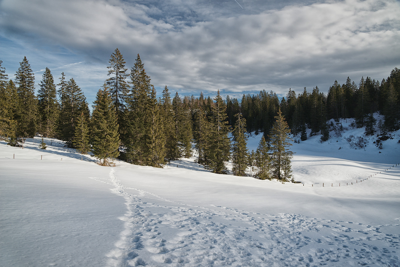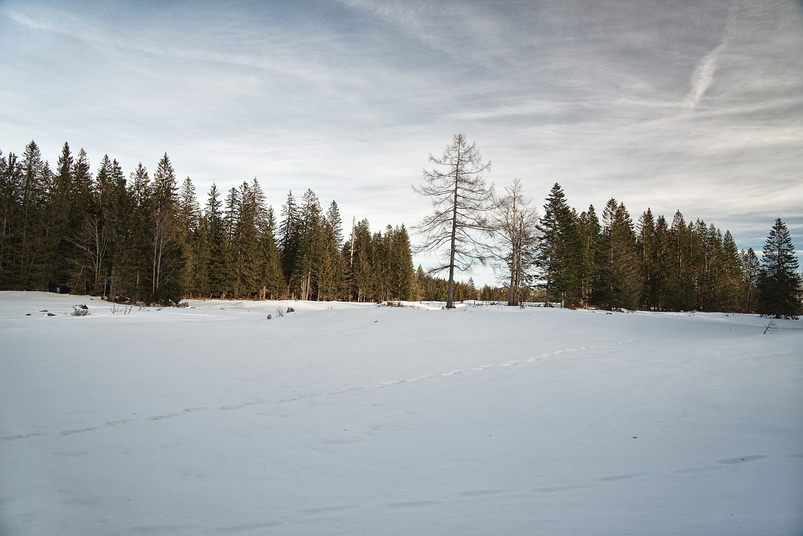 Hier beginnt nun ein Abenteuer in einer fantastischen Winterlandschaft, auch wenn die Bäume natürlich längst frei von Schnee sind. Wanderer haben bereits einen Trampelpfad in die weite schneebedeckte Landschaft gezeichnet. Dadurch ist der Schnee in der Spur etwas komprimiert und lässt mich nicht so tief einsinken, zumindest auf dem Hinweg. Ein Abgleich mit dem GPS zeigt mir, dass mich die Spuren nicht in die Irre leiten. Nach einer kleinen Kuppe kommen auch schon die ersten Gebäude in Sicht. Der höchste Punkt meiner Wanderung ist mit etwa 1.225 Metern Meereshöhe kurz vor den Almhütten erreicht.