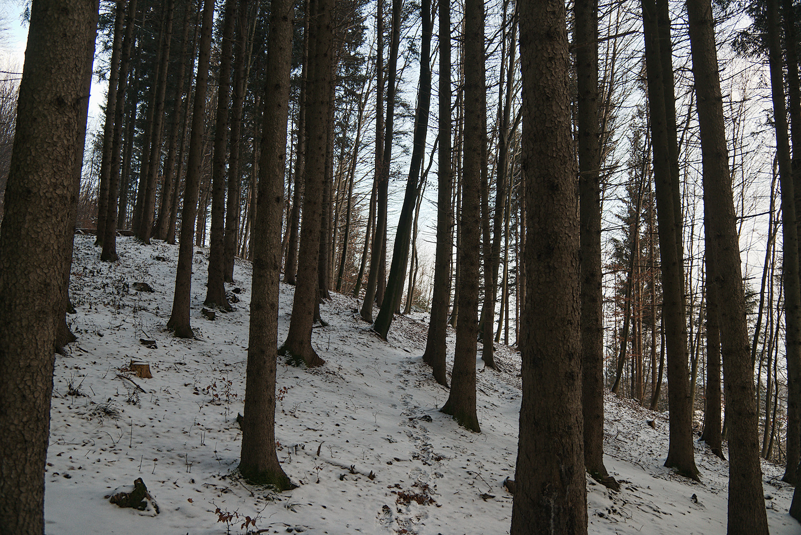 Ein kurzer Blick auf die Karte verrät mir, dass auch der Weg über den Wall zum Rundweg führt, ich also nicht mehr diesen steilen, schneebedeckten Weg zurück nehmen muss. So marschiere ich gemütlich auf dem Wall entlang, auf dem im Übrigen auch ein Karrenweg verläuft. Dieser bringt mich am Ende doch etwas steiler wieder zum Panoramaweg hinunter.