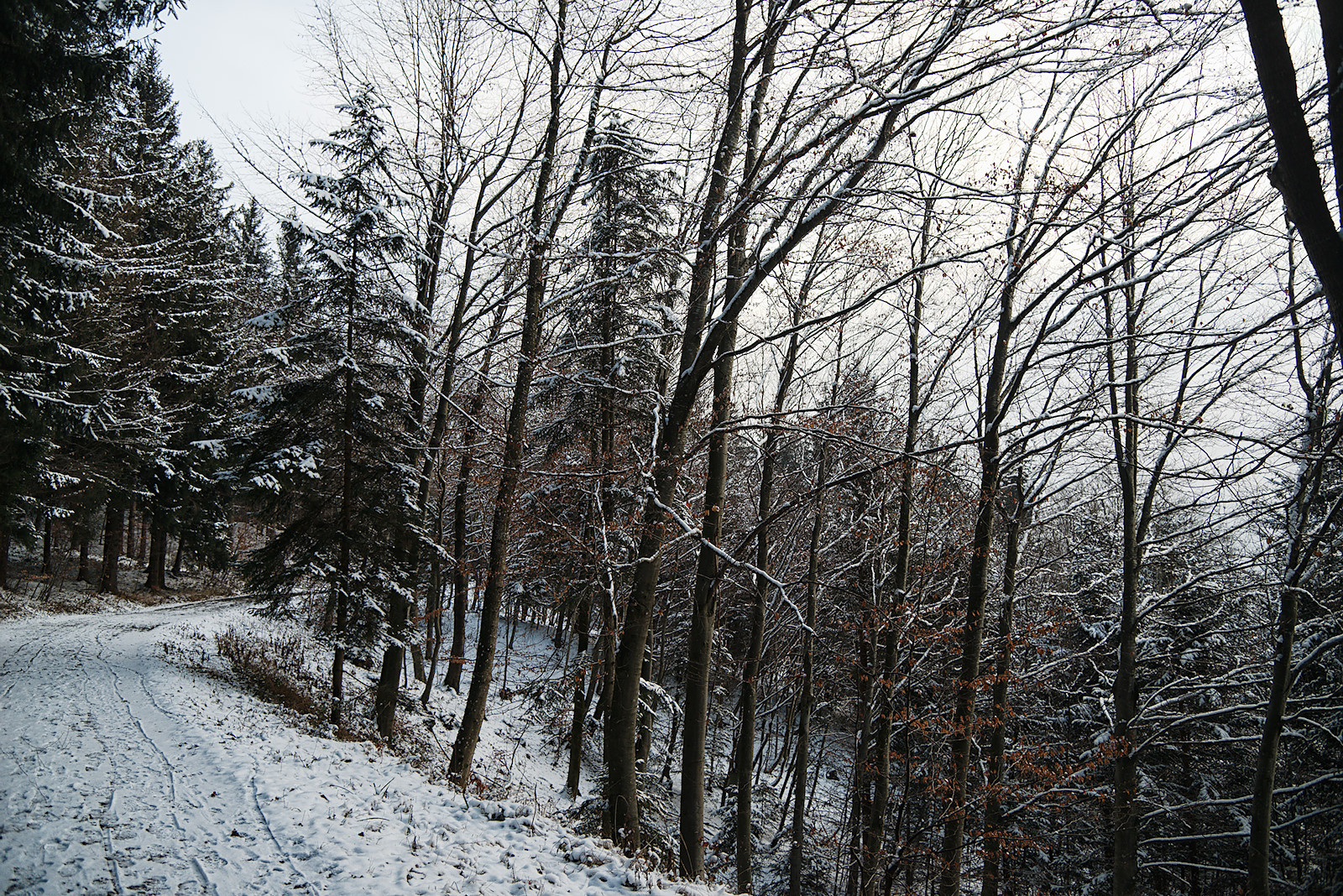 Die Freude währt aber nicht allzu lange und ich stoße nach ein paar Minuten wieder auf eine Forststraße. Auf dieser geht es nun den ganzen Weg unterhalb des Gipfelbereichs zurück. Ausblicke gibt es dabei nur sporadisch und wenn, dann nur zwischen den Bäumen hindurch. Außerdem ist es nach wie vor ziemlich trüb, so dass sich nur grob die Strukturen der Landschaft erkennen lassen. Was ich jedoch erahnen kann, ist, dass sich ein tiefer, spektakulärer Graben zu meiner Rechten befindet. Dieser ist einer Hangrutschung geschuldet, wie sie bei Flyschbergen immer wieder auftritt.
