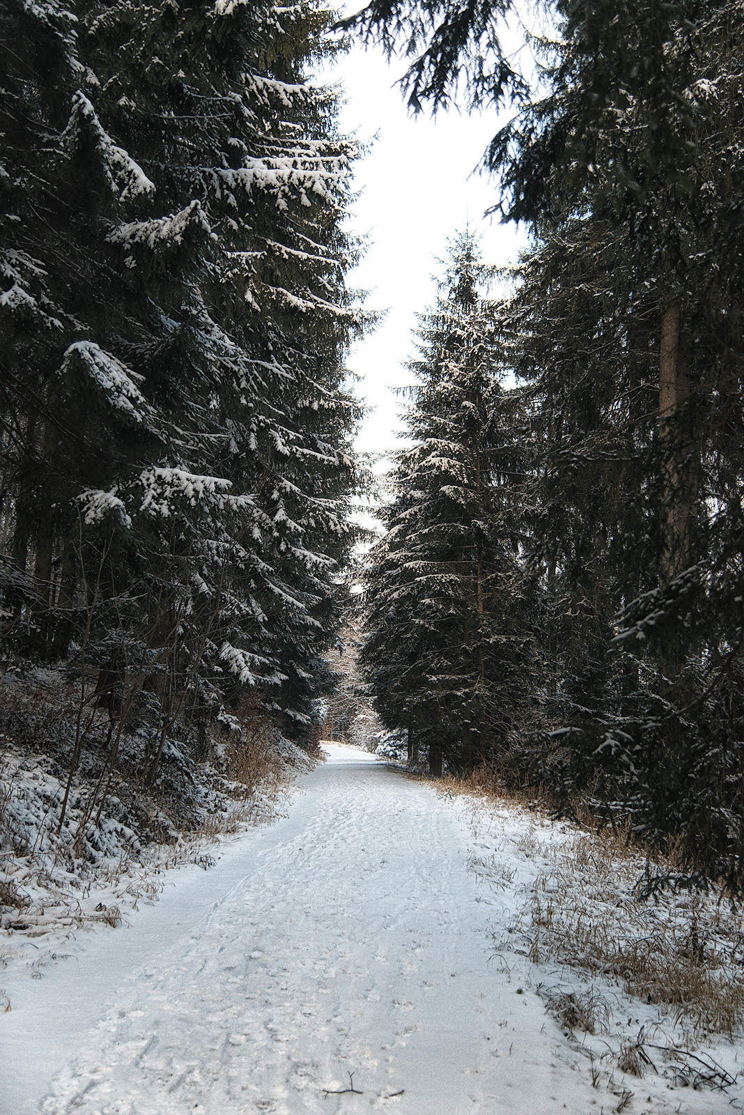 Nach dem Radarturm geht es immer der Forststraße entlang durch die malerische Winterlandschaft. Doch der Sonnenschein ist längst nicht mehr ungetrübt. Immer mehr Nebel breitet sich aus, der langsam aber sicher das Gestirn verschluckt. Bald würde sich ein guter Ausblick nach Norden ergeben, doch die Fernsicht wird leider immer schlechter.